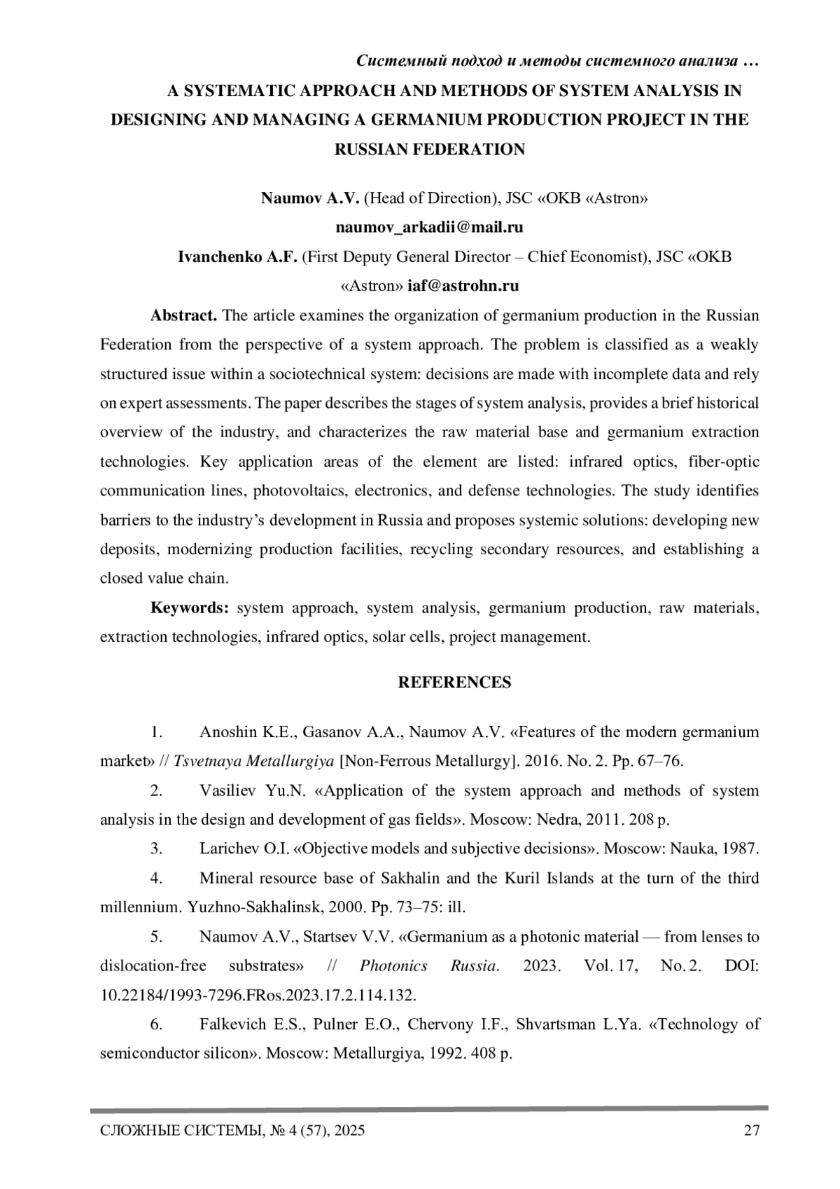 Ключевые фразы: системный подход, системный анализ, производство германия, СЫРЬЕВЫЕ РЕСУРСЫ, технологии извлечения, ик‑оптика, солнечные батареи, УПРАВЛЕНИЕ ПРОЕКТАМИ