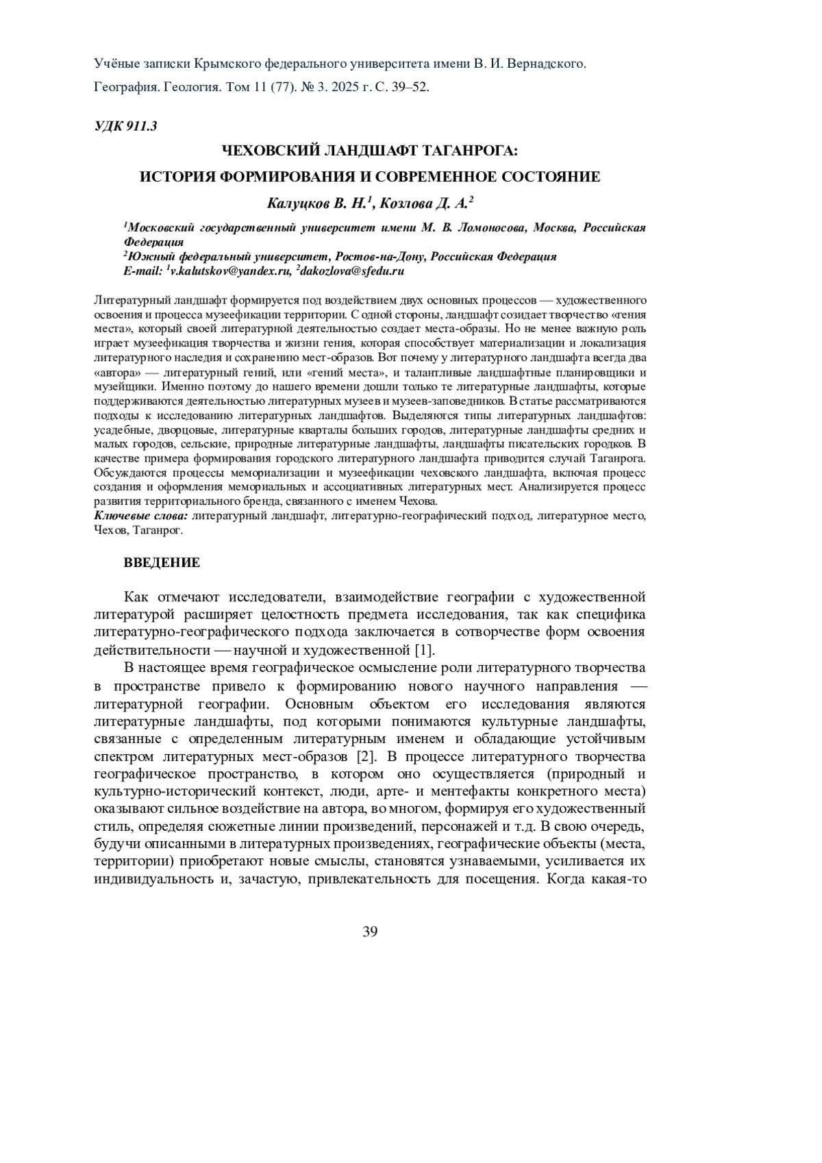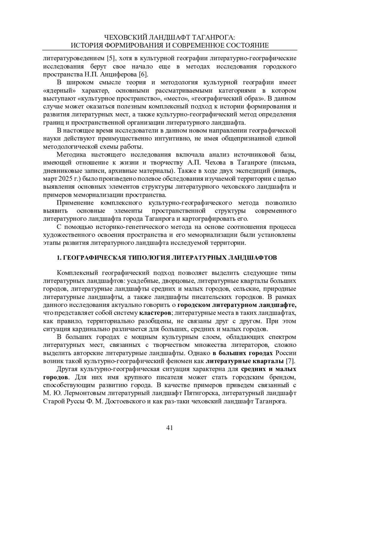 Литературный ландшафт формируется под воздействием двух основных процессов художественного освоения и процесса музеефикации территории. С одной стороны, ландшафт созидает творчество «гения места», который своей литературной деятельностью создает места-образы. Но не менее важную роль играет музеефикация творчества и жизни гения, которая способствует материализации и локализация литературного наследия и сохранению мест-образов. Вот почему у литературного ландшафта всегда два «автора» литературный гений, или «гений места», и талантливые ландшафтные планировщики и музейщики. Именно поэтому до нашего времени дошли только те литературные ландшафты, которые поддерживаются деятельностью литературных музеев и музеев-заповедников. В статье рассматриваются подходы к исследованию литературных ландшафтов. Выделяются типы литературных ландшафтов: усадебные, дворцовые, литературные кварталы больших городов, литературные ландшафты средних и малых городов, сельские, природные литературные ландшафты, ландшафты писательских городков. В качестве примера формирования городского литературного ландшафта приводится случай Таганрога. Обсуждаются процессы мемориализации и музеефикации чеховского ландшафта, включая процесс создания и оформления мемориальных и ассоциативных литературных мест. Анализируется процесс развития территориального бренда, связанного с именем Чехова.