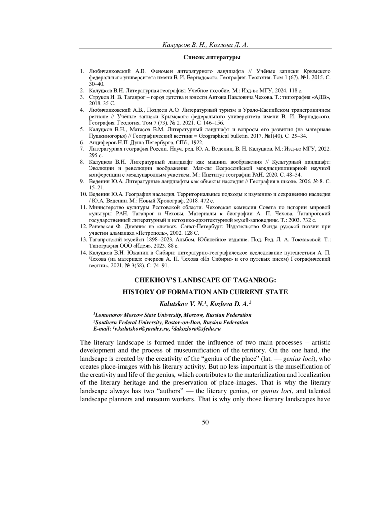 8. Калуцков В.Н. Литературный ландшафт как машина воображения // Культурный ландшафт: Эволюции и революции воображения. Мат-лы Всероссийской междисциплинарной научной конференции с международным участием. М.: Институт географии РАН. 2020. С. 48-54.