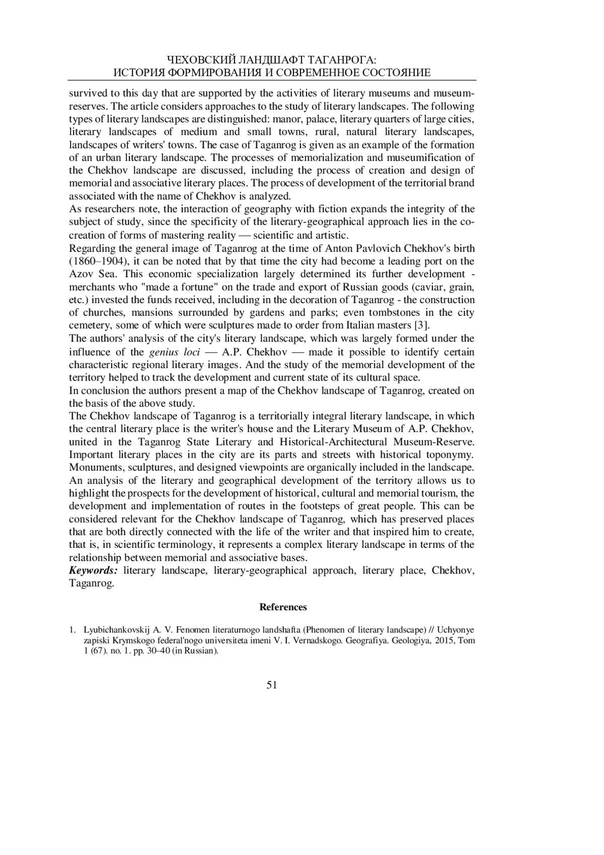 1. Любичанковский А.В. Феномен литературного ландшафта // Учёные записки Крымского федерального университета имени В. И. Вернадского. География. Геология. Том 1 (67). №1. 2015. С. 30-40.