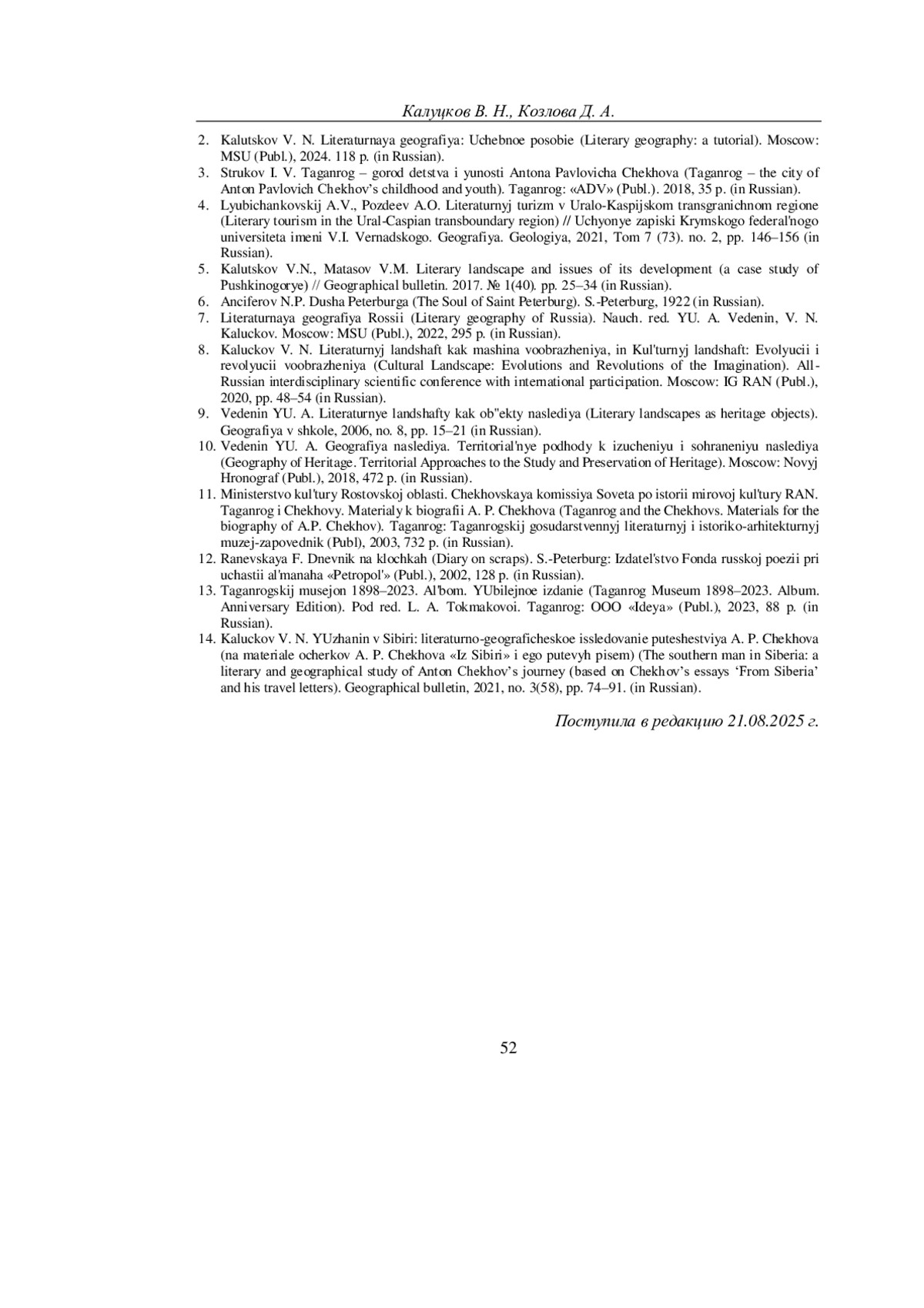 14. Калуцков В.Н. Южанин в Сибири: литературно-географическое исследование путешествия А. П. Чехова (на материале очерков А. П. Чехова «Из Сибири» и его путевых писем) Географический вестник. 2021. № 3(58). С. 74-91.