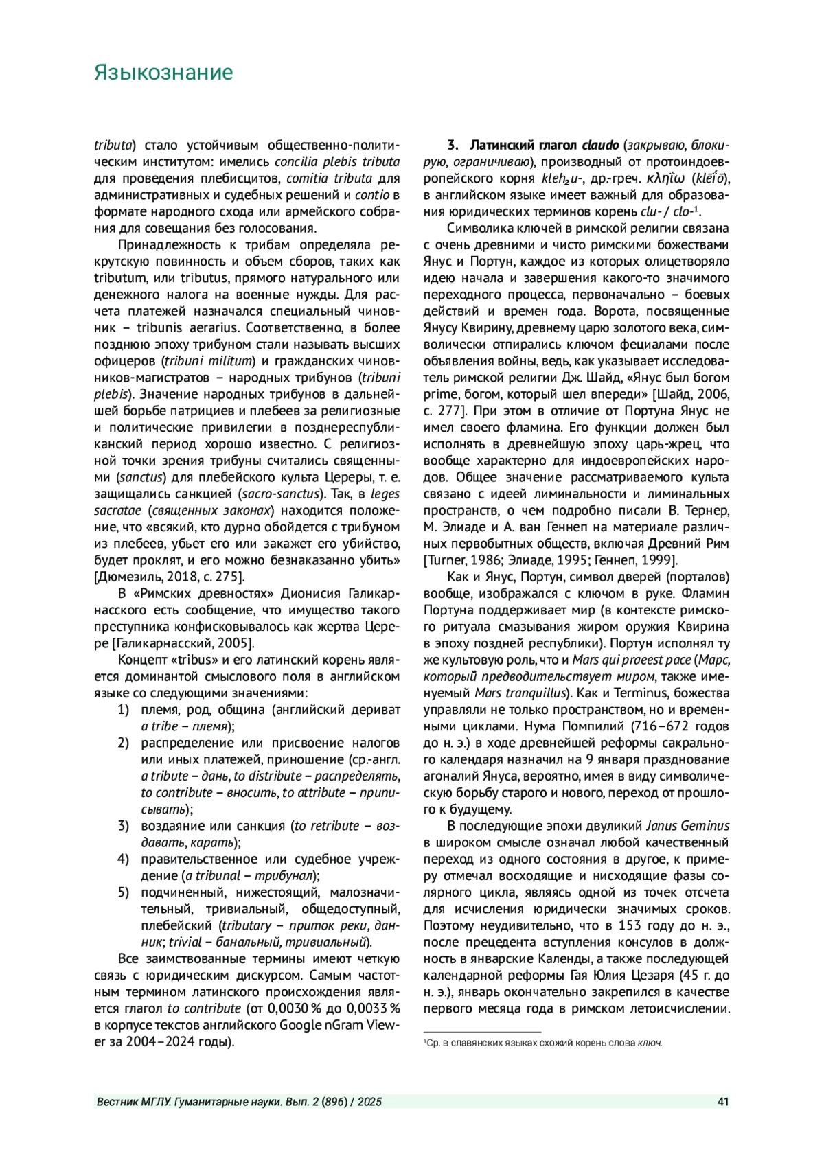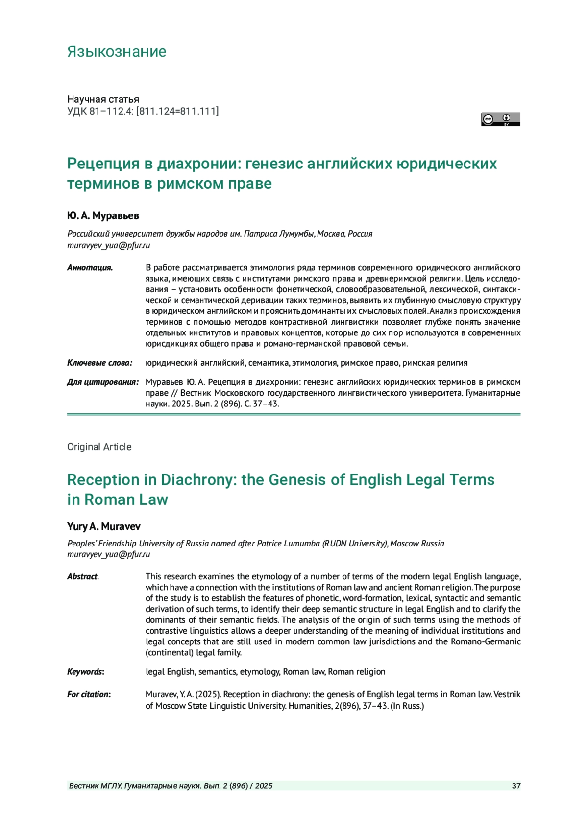 В работе рассматривается этимология ряда терминов современного юридического английского языка, имеющих связь с институтами римского права и древнеримской религии. Цель исследования - установить особенности фонетической, словообразовательной, лексической, синтаксической и семантической деривации таких терминов, выявить их глубинную смысловую структуру в юридическом английском и прояснить доминанты их смысловых полей. Анализ происхождения терминов с помощью методов контрастивной лингвистики позволяет глубже понять значение отдельных институтов и правовых концептов, которые до сих пор используются в современных юрисдикциях общего права и романо-германской правовой семьи.