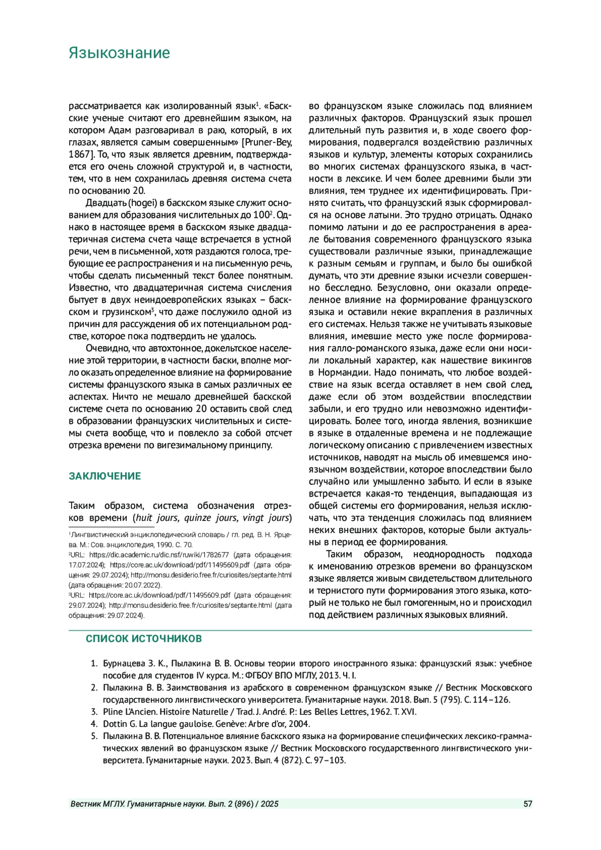 5. Пылакина В. В. Потенциальное влияние баскского языка на формирование специфических лексико-грамматических явлений во французском языке // Вестник Московского государственного лингвистического университета. Гуманитарные науки. 2023. Вып. 4 (872). С. 97-103. EDN: BOVKPZ