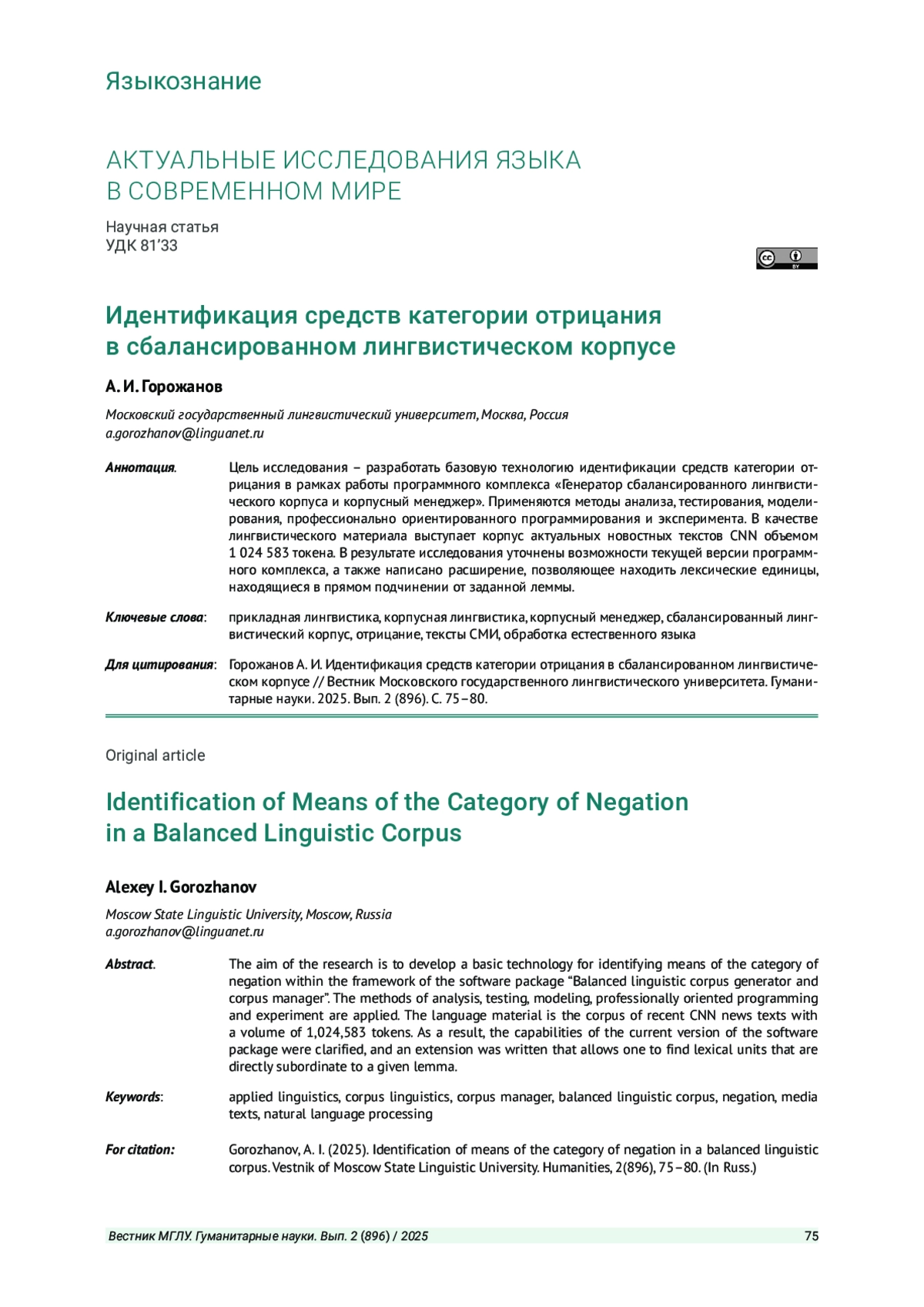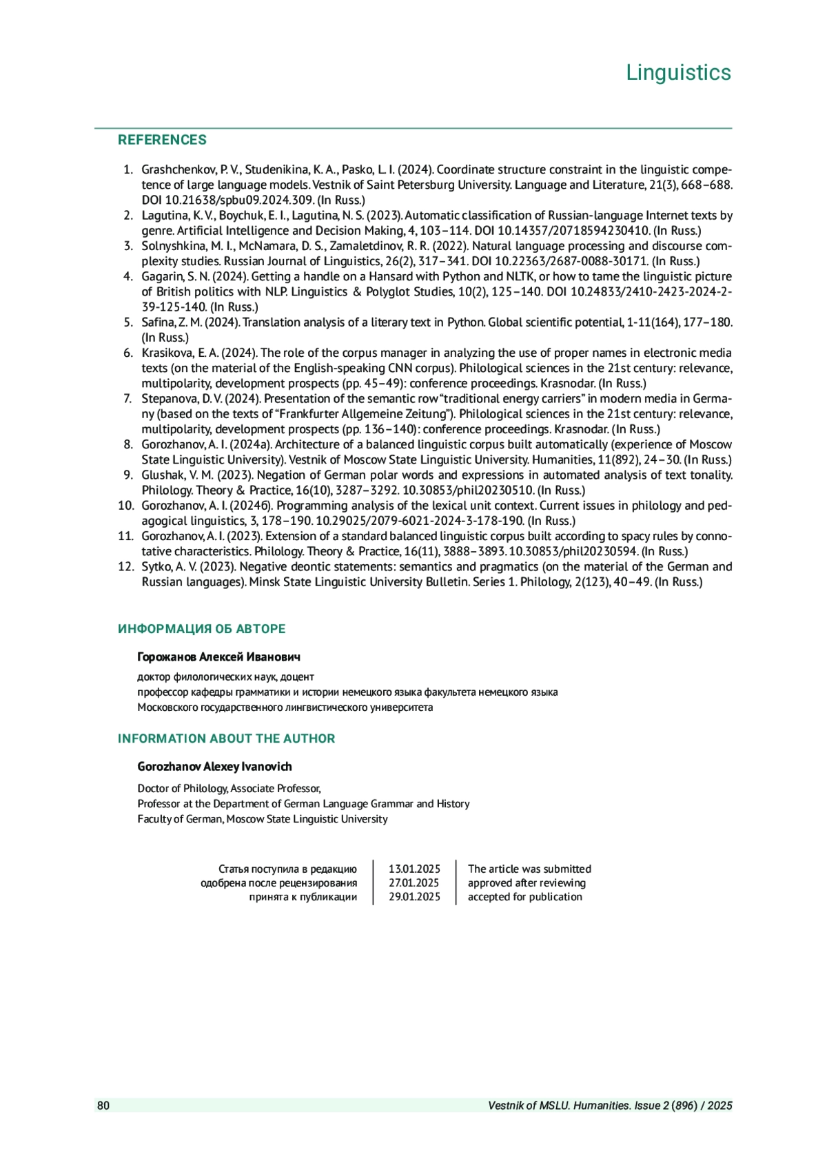 10. Горожанов А. И. Метод программного анализа контекста лексической единицы // Актуальные проблемы филологии и педагогической лингвистики. 2024б. № 3. С. 178-190. DOI: 10.29025/2079-6021-2024-3-178-190 EDN: QNFATA