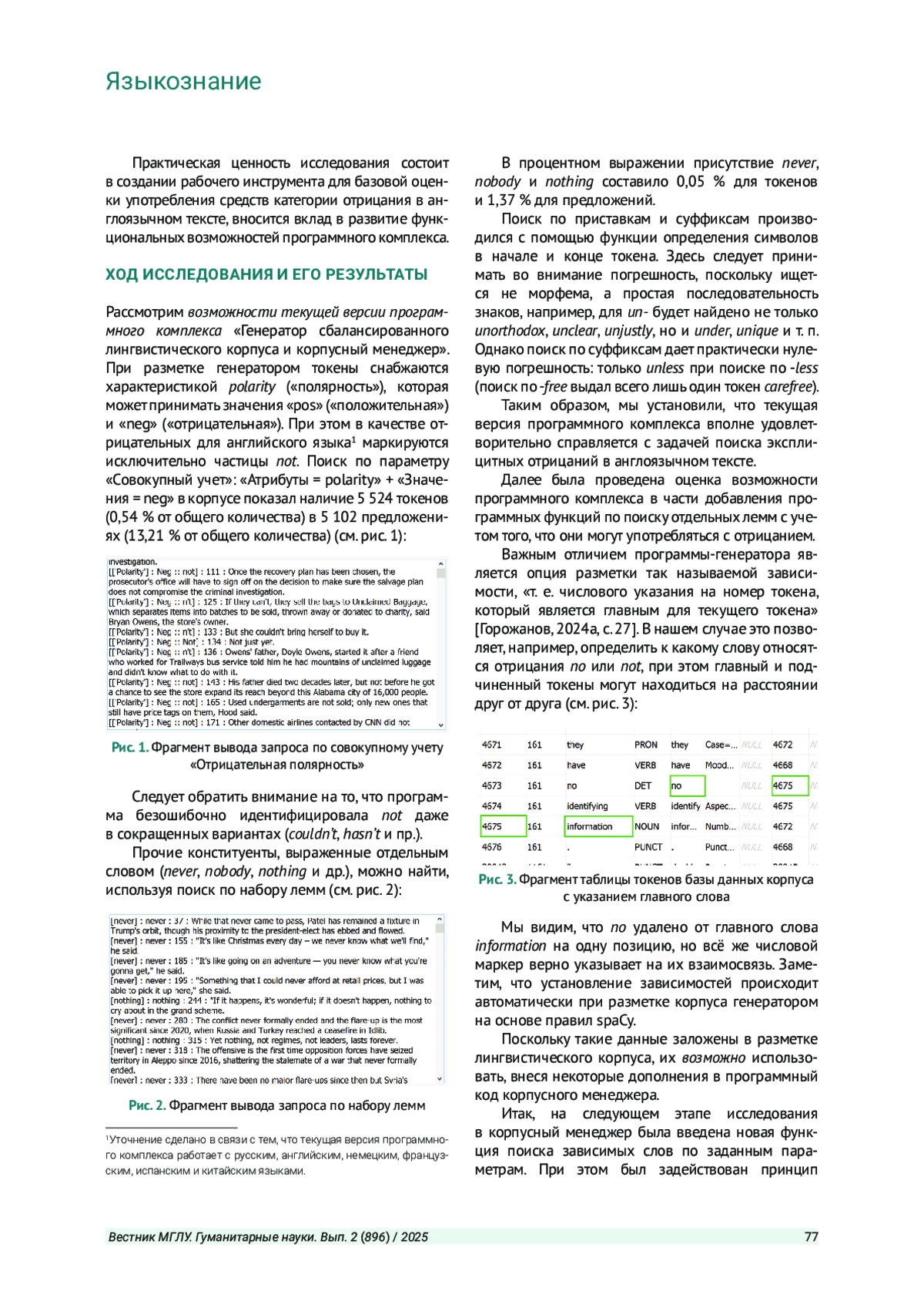 Цель исследования - разработать базовую технологию идентификации средств категории отрицания в рамках работы программного комплекса «Генератор сбалансированного лингвистического корпуса и корпусный менеджер». Применяются методы анализа, тестирования, моделирования, профессионально ориентированного программирования и эксперимента. В качестве лингвистического материала выступает корпус актуальных новостных текстов CNN объемом 1 024 583 токена. В результате исследования уточнены возможности текущей версии программного комплекса, а также написано расширение, позволяющее находить лексические единицы, находящиеся в прямом подчинении от заданной леммы.