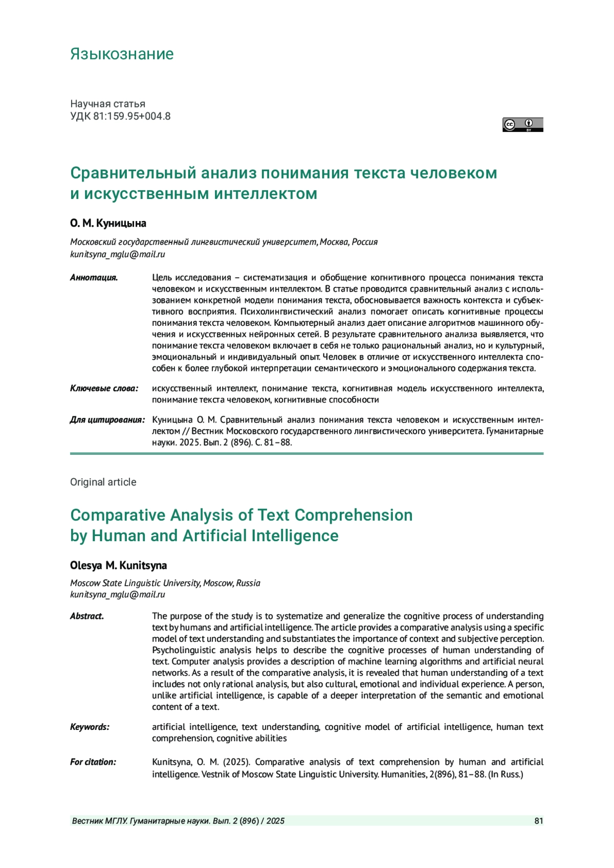 Цель исследования - систематизация и обобщение когнитивного процесса понимания текста человеком и искусственным интеллектом. В статье проводится сравнительный анализ с использованием конкретной модели понимания текста, обосновывается важность контекста и субъективного восприятия. Психолингвистический анализ помогает описать когнитивные процессы понимания текста человеком. Компьютерный анализ дает описание алгоритмов машинного обучения и искусственных нейронных сетей. В результате сравнительного анализа выявляется, что понимание текста человеком включает в себя не только рациональный анализ, но и культурный, эмоциональный и индивидуальный опыт. Человек в отличие от искусственного интеллекта способен к более глубокой интерпретации семантического и эмоционального содержания текста.