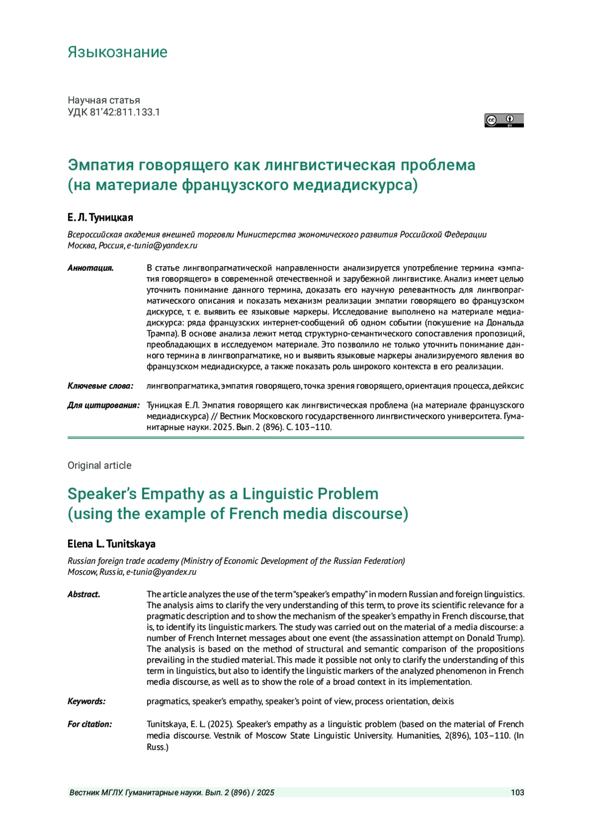 В статье лингвопрагматической направленности анализируется употребление термина «эмпатия говорящего» в современной отечественной и зарубежной лингвистике. Анализ имеет целью уточнить понимание данного термина, доказать его научную релевантность для лингвопрагматического описания и показать механизм реализации эмпатии говорящего во французском дискурсе, т. е. выявить ее языковые маркеры. Исследование выполнено на материале медиадискурса: ряда французских интернет-сообщений об одном событии (покушение на Дональда Трампа). В основе анализа лежит метод структурно-семантического сопоставления пропозиций, преобладающих в исследуемом материале. Это позволило не только уточнить понимание данного термина в лингвопрагматике, но и выявить языковые маркеры анализируемого явления во французском медиадискурсе, а также показать роль широкого контекста в его реализации.