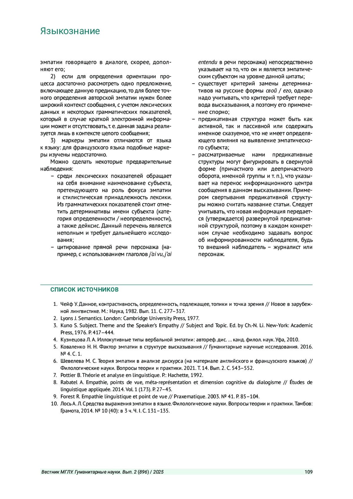 10. Лось А. Л. Средства выражения эмпатии в языке. Филологические науки. Вопросы теории и практики. Тамбов: Грамота, 2014. № 10 (40): в 3 ч. Ч. I. C. 131-135.