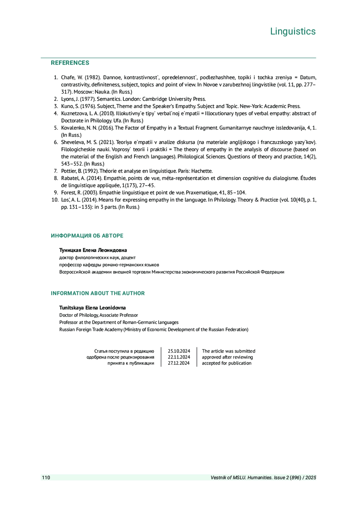 6. Шевелева М. С. Теория эмпатии в анализе дискурса (на материале английского и французского языков) // Филологические науки. Вопросы теории и практики. 2021. Т. 14. Вып. 2. С. 543-552. EDN: HZOOLO