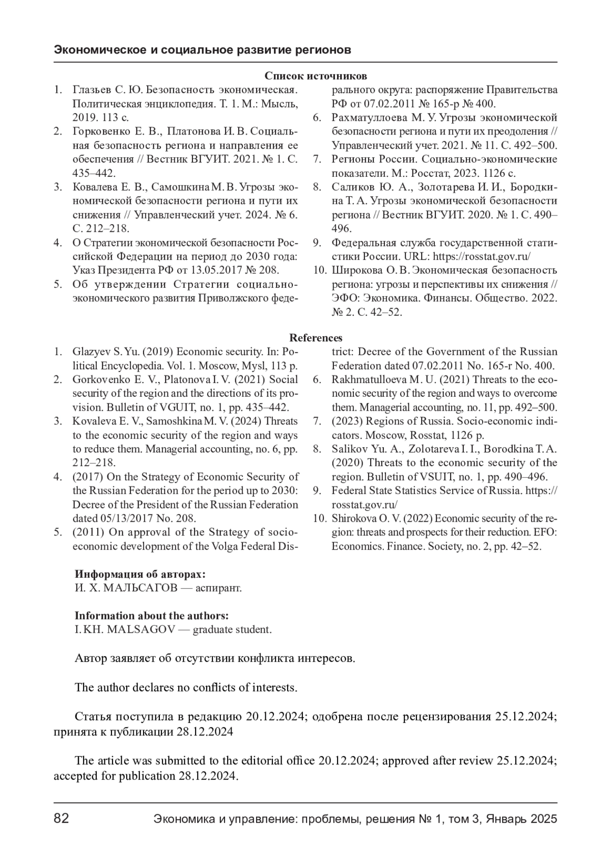 3. Ковалева Е. В., Самошкина М. В. Угрозы экономической безопасности региона и пути их снижения // Управленческий учет. 2024. № 6.С. 212-218. EDN: HUWXQN
