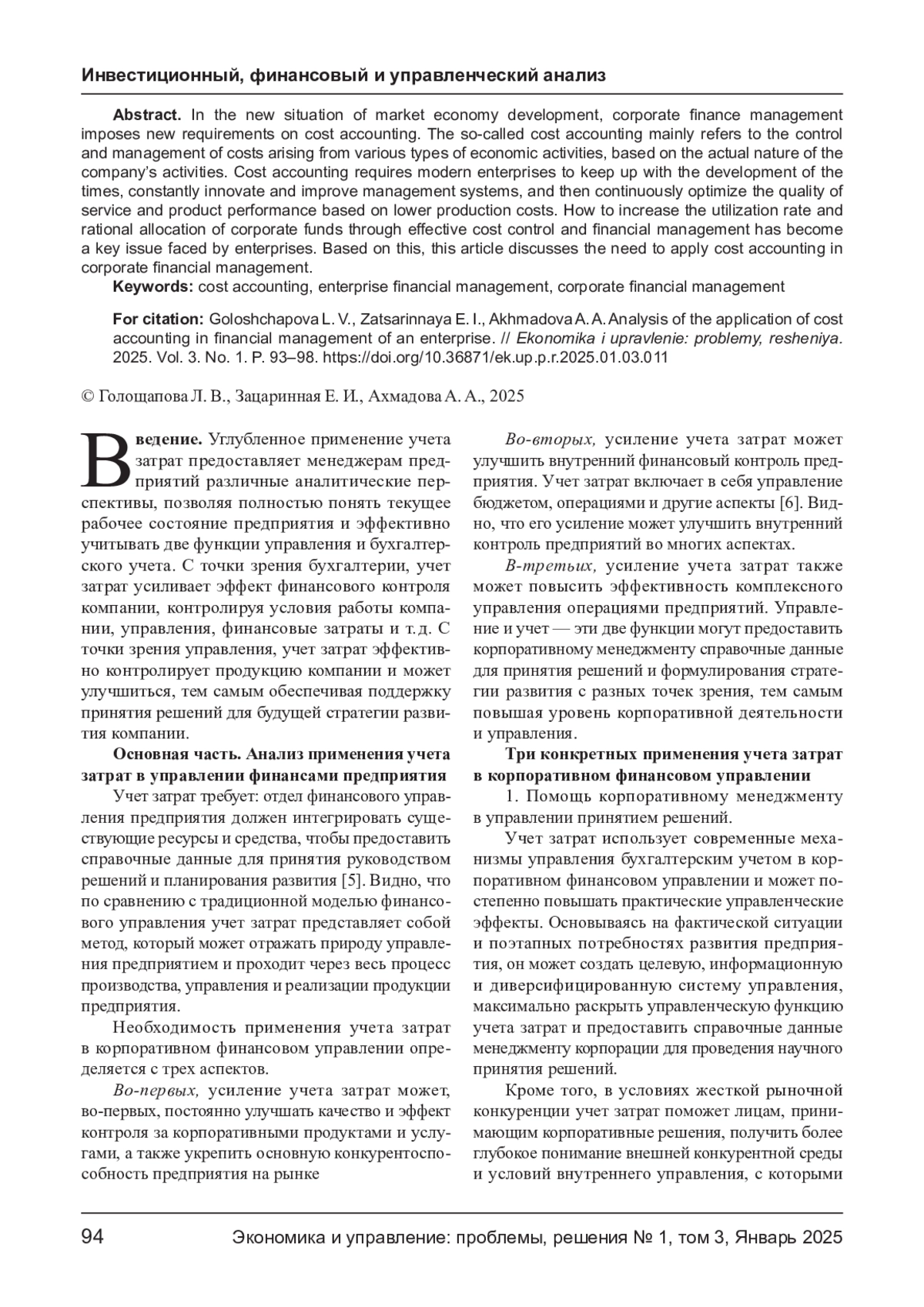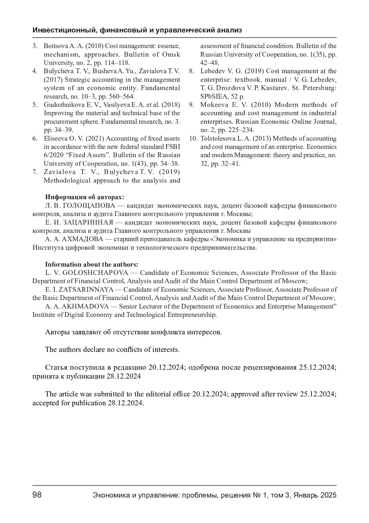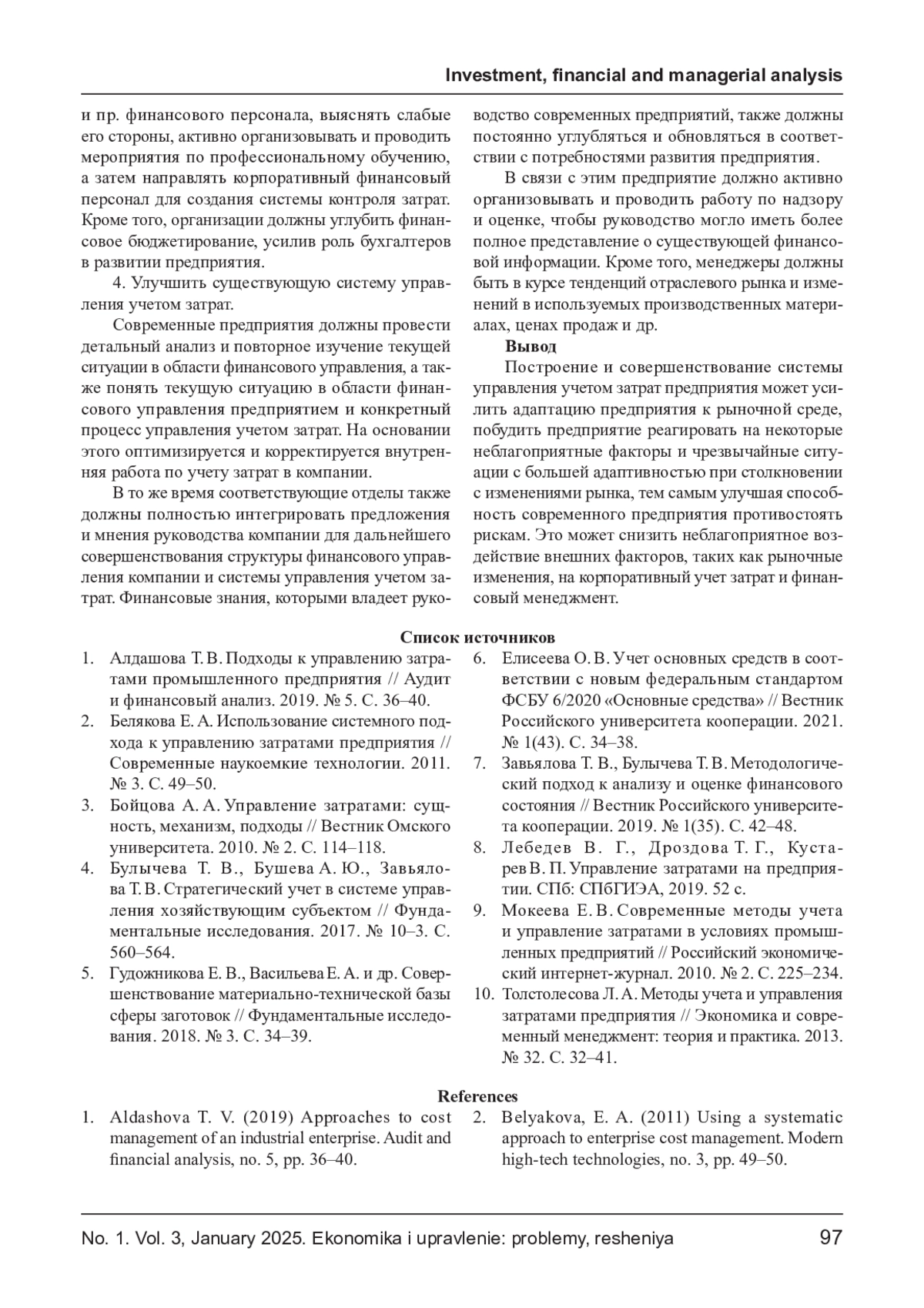 1. Алдашова Т. В. Подходы к управлению затратами промышленного предприятия // Аудит и финансовый анализ. 2019. № 5. С. 36-40.