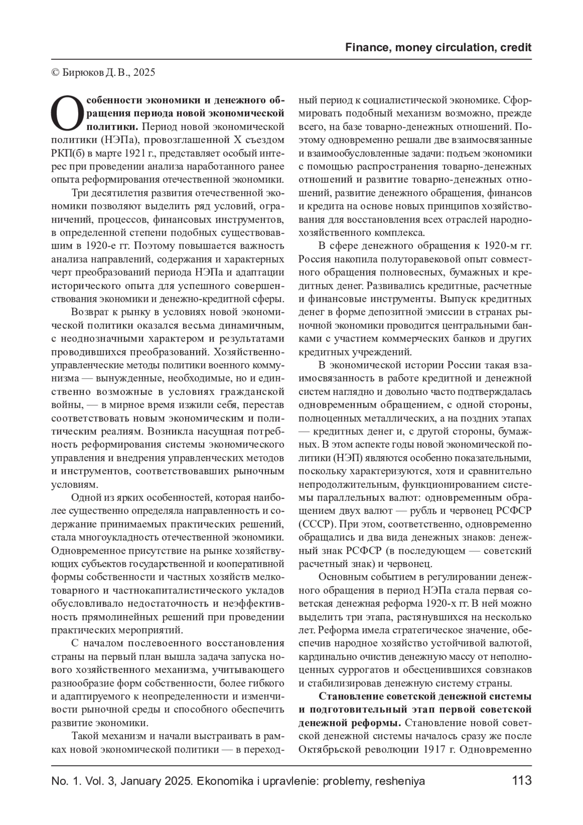 В статье рассматриваются исторические аспекты оздоровления и развития денежного обращения России в период проведения новой экономической политики (НЭП). С учетом относительного подобия существовавших в 1920-е годы и современных ограничений, условий, процессов и финансовых инструментов обусловлена актуальность анализа и практического учета исторического опыта регулирования денежной системы и денежного обращения. Раскрываются особенности экономики и денежного обращения периода НЭПа. Анализируются последовательность, этапы и содержание мероприятий по реформированию денежного хозяйства страны. В рамках реформирования и оздоровления денежного обращения определяется значение эмиссии советского золотого червонца, как основного мероприятия денежной реформы.
