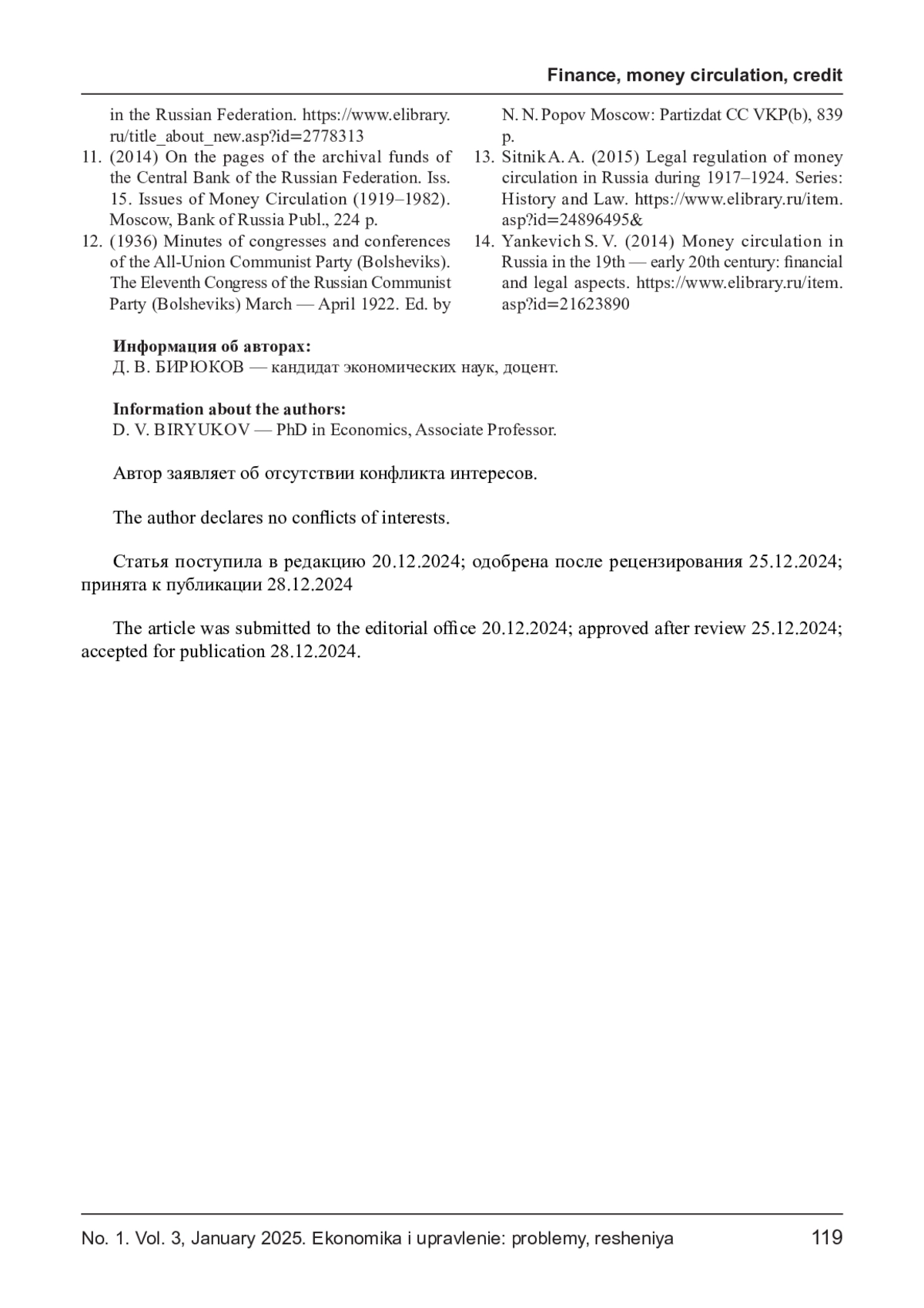 13. Ситник А. А. Правовое регулирование денежного обращения в России в период 1917-1924 годов. 2015. URL: https://www.elibrary.ru/item.asp?id=24896495&.