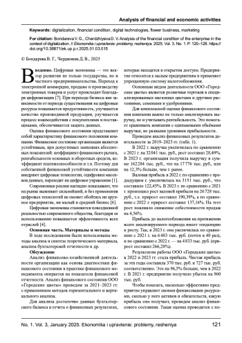 В статье проведен анализ показателей, характеризующих финансовое состояние предприятия, выявлена зависимость финансовой устойчивости от цифровых технологий. Финансовое состояние и цифровизация - вектор развития фирм. Проработана методика анализа ключевых показателей финансового состояния организация, и дан краткий вывод о её состоянии в 2021-2023 гг. После анализа выделены и систематизированы ключевые индикаторы финансового положения и результативности деятельности ООО «Городские цветы» за весь анализируемый период.