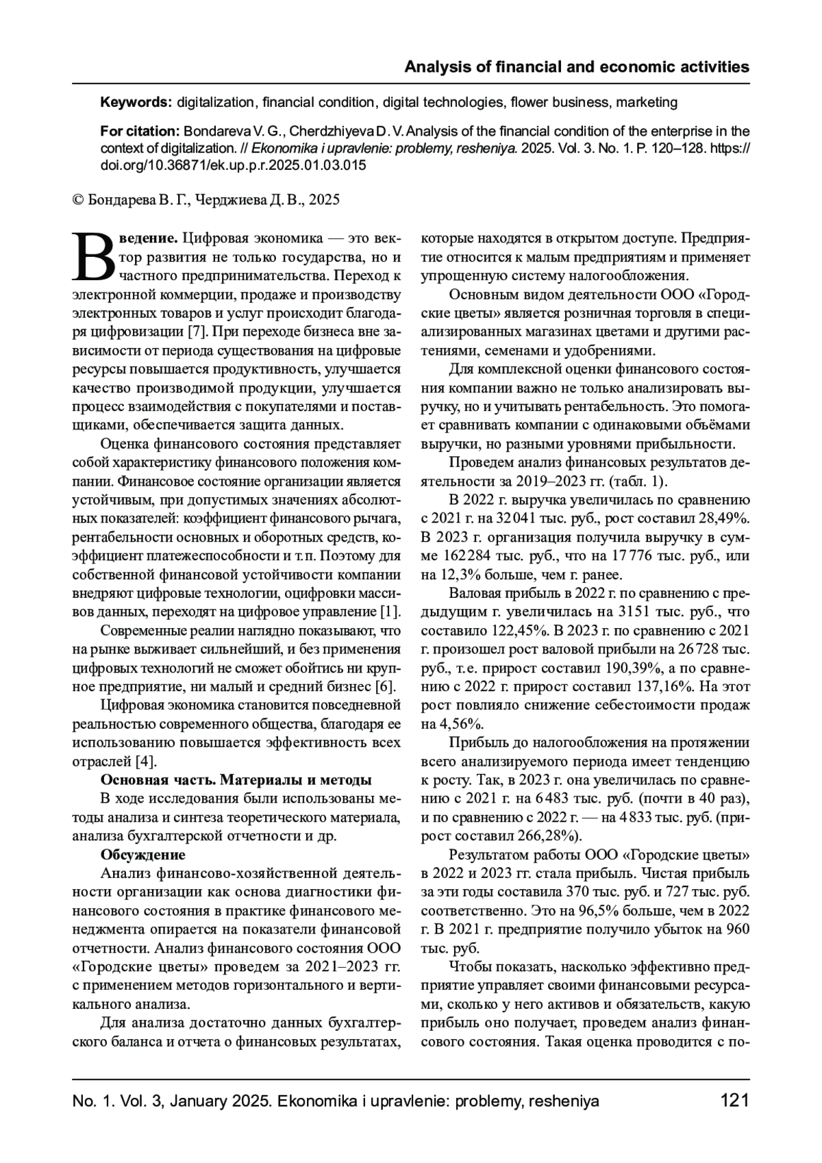 6. Федотова А. А. Анализ финансового состояния предприятия в условиях цифровизации на примере ООО “Юхас” // Бизнес-трансформация: управление улучшениями. 2023. № 1. С. 69-73. EDN: TVZXQE