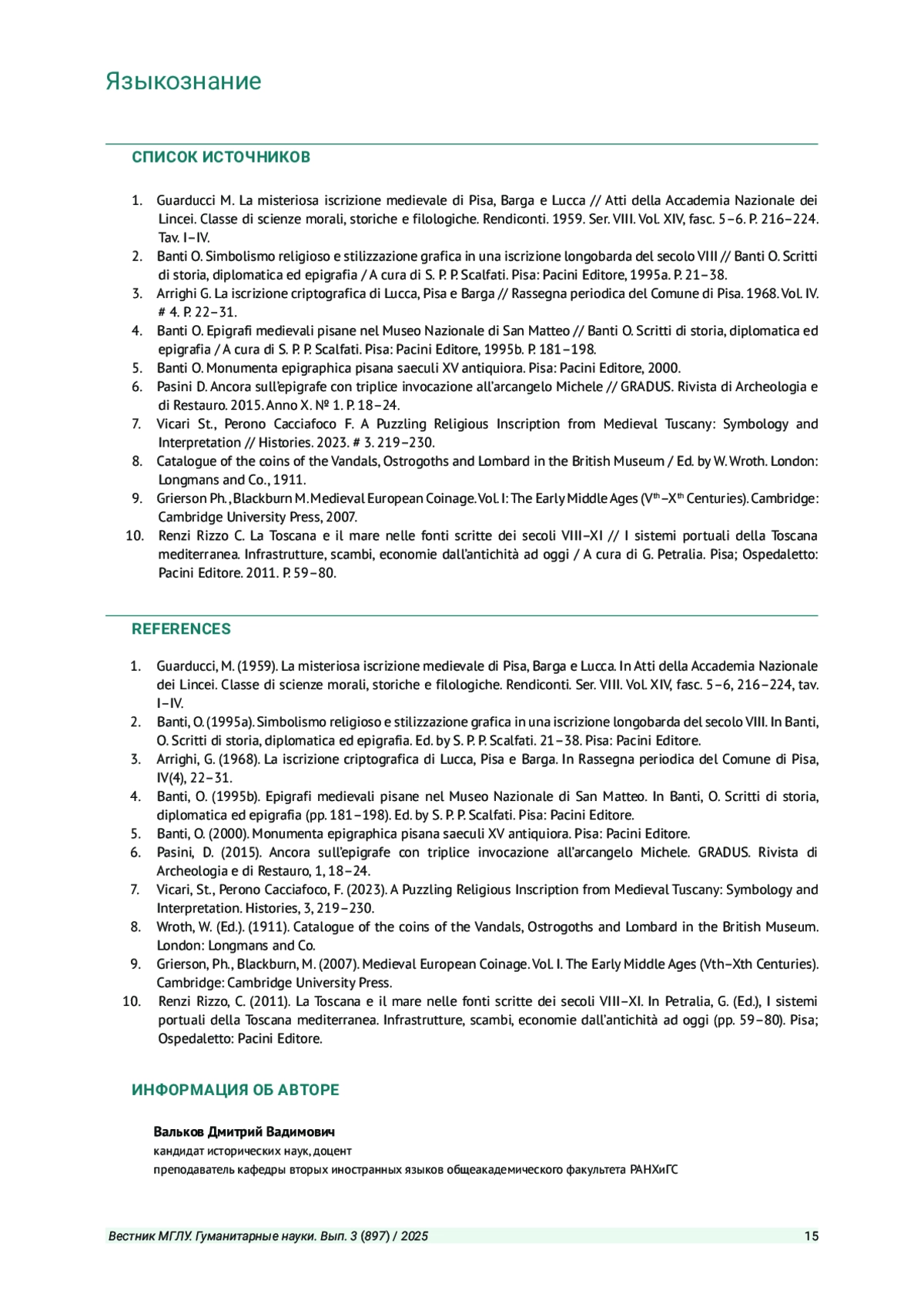 7. Vicari St., Perono Cacciafoco F. A Puzzling Religious Inscription from Medieval Tuscany: Symbology and Interpretation // Histories. 2023. # 3. 219-230. EDN: BAEAWF