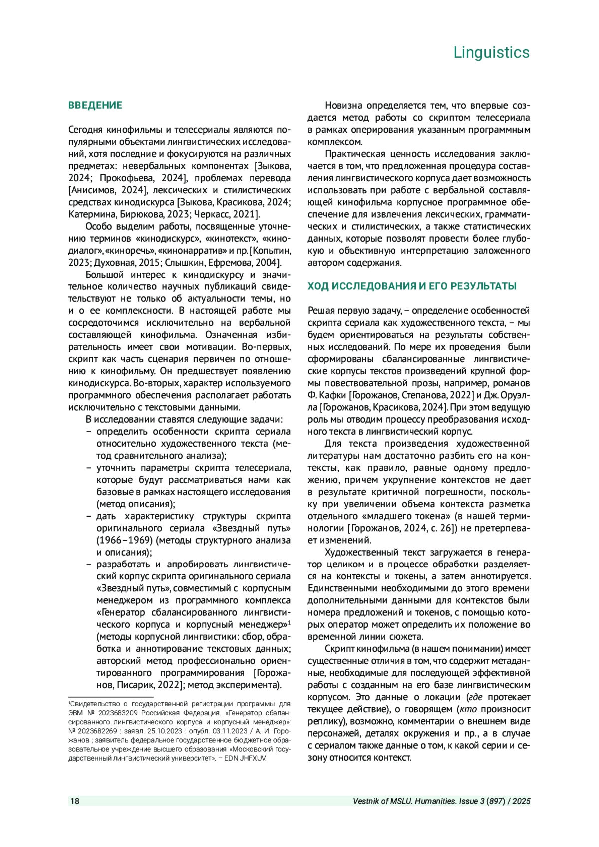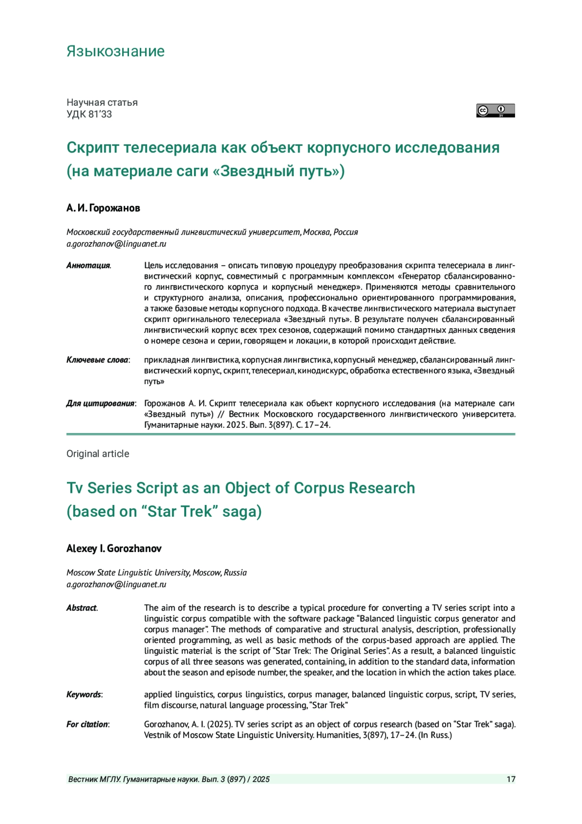 Цель исследования - описать типовую процедуру преобразования скрипта телесериала в лингвистический корпус, совместимый с программным комплексом «Генератор сбалансированного лингвистического корпуса и корпусный менеджер». Применяются методы сравнительного и структурного анализа, описания, профессионально ориентированного программирования, а также базовые методы корпусного подхода. В качестве лингвистического материала выступает скрипт оригинального телесериала «Звездный путь». В результате получен сбалансированный лингвистический корпус всех трех сезонов, содержащий помимо стандартных данных сведения о номере сезона и серии, говорящем и локации, в которой происходит действие.