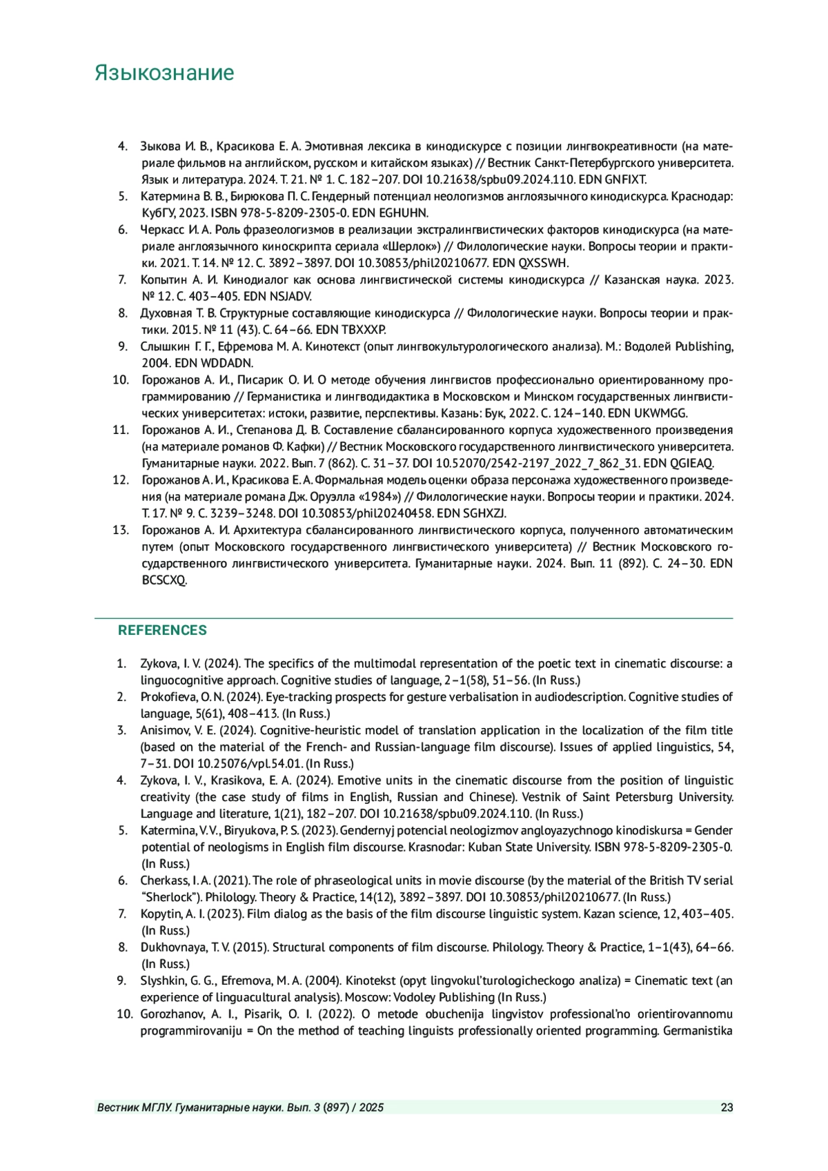 4. Зыкова И. В., Красикова Е. А. Эмотивная лексика в кинодискурсе с позиции лингвокреативности (на материале фильмов на английском, русском и китайском языках) // Вестник Санкт-Петербургского университета. Язык и литература. 2024. Т. 21. № 1. С. 182-207. DOI: 10.21638/spbu09.2024.110 EDN: GNFIXT