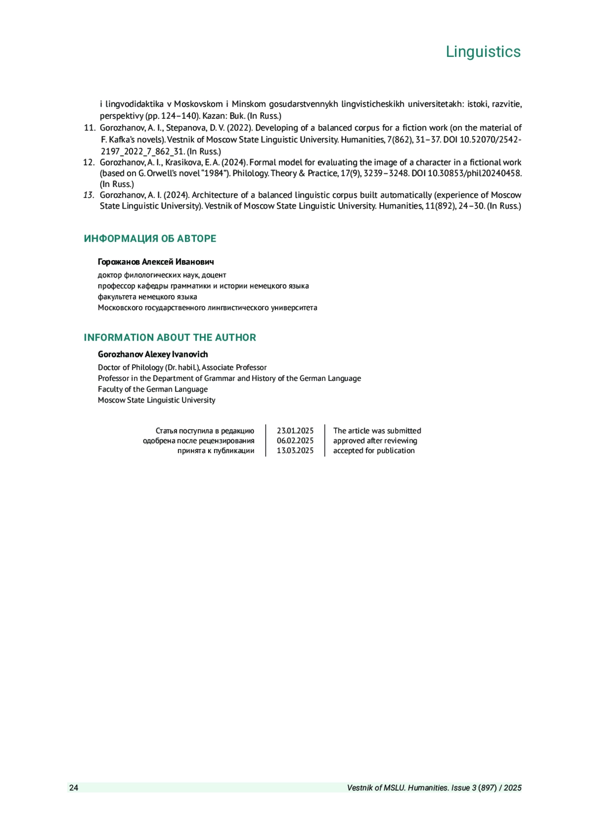11. Горожанов А. И., Степанова Д. В. Составление сбалансированного корпуса художественного произведения (на материале романов Ф. Кафки) // Вестник Московского государственного лингвистического университета. Гуманитарные науки. 2022. Вып. 7 (862). С. 31-37. DOI: 10.52070/2542-2197_2022_7_862_31 EDN: QGIEAQ