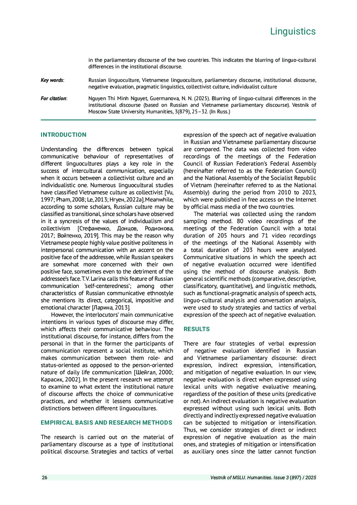Understanding the differences between typical communicative behaviour of representatives of different linguocultures plays a key role in the success of intercultural communication, especially when it occurs between a collectivist culture and an individualistic one. Numerous linguocultural studies have classified Vietnamese culture as collectivist [Vu, 1997; Pham, 2008; Le, 2013; Нгуен, 2022a].