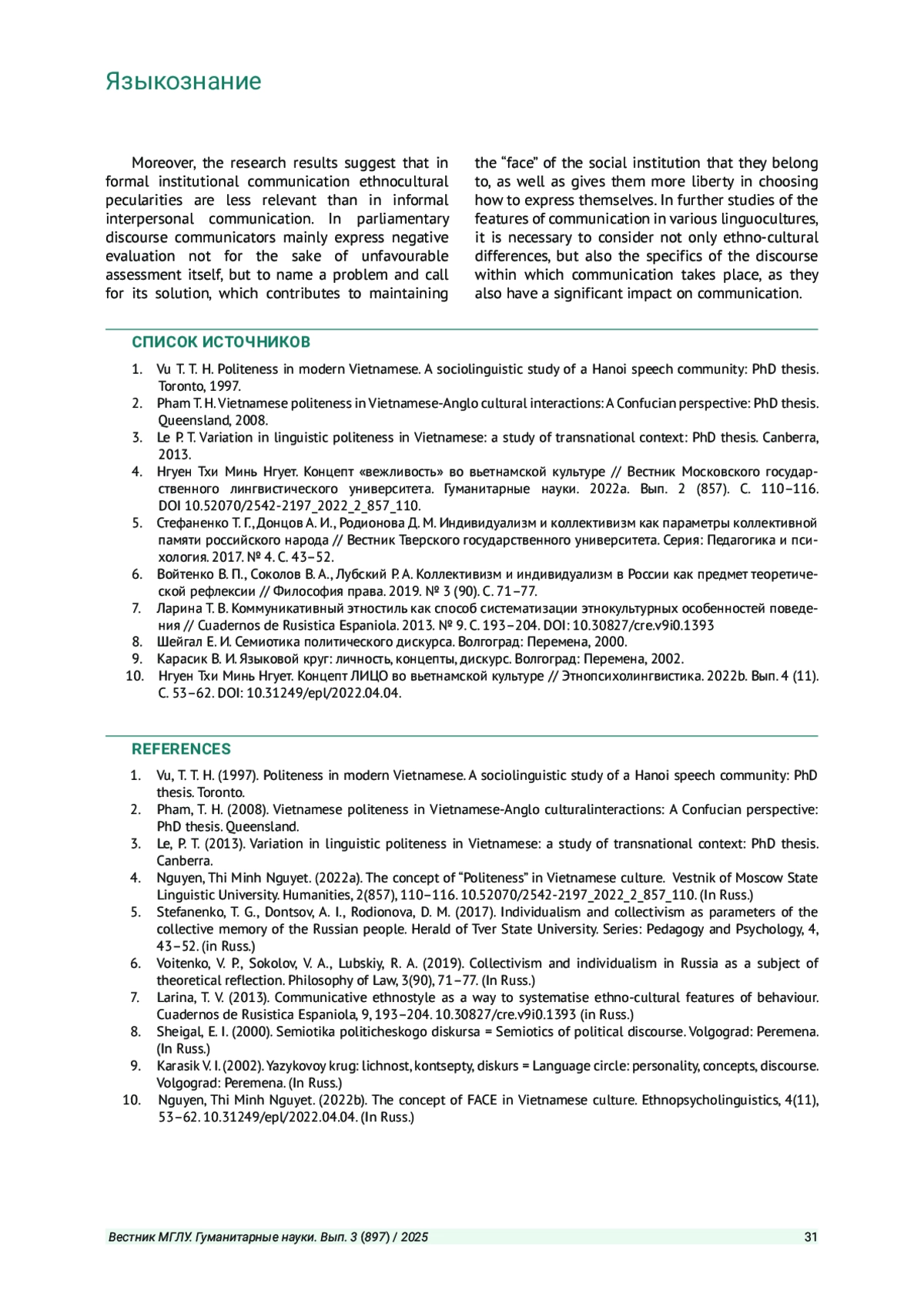 10. Нгуен Тхи Минь Нгует. Концепт ЛИЦО во вьетнамской культуре // Этнопсихолингвистика. 2022b. Вып. 4 (11). С. 53-62. DOI: 10.31249/epl/2022.04.04