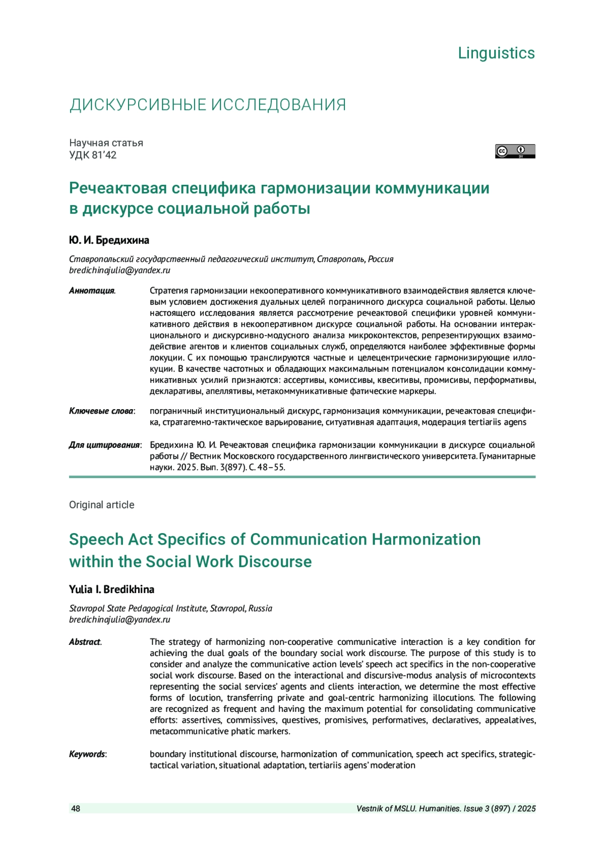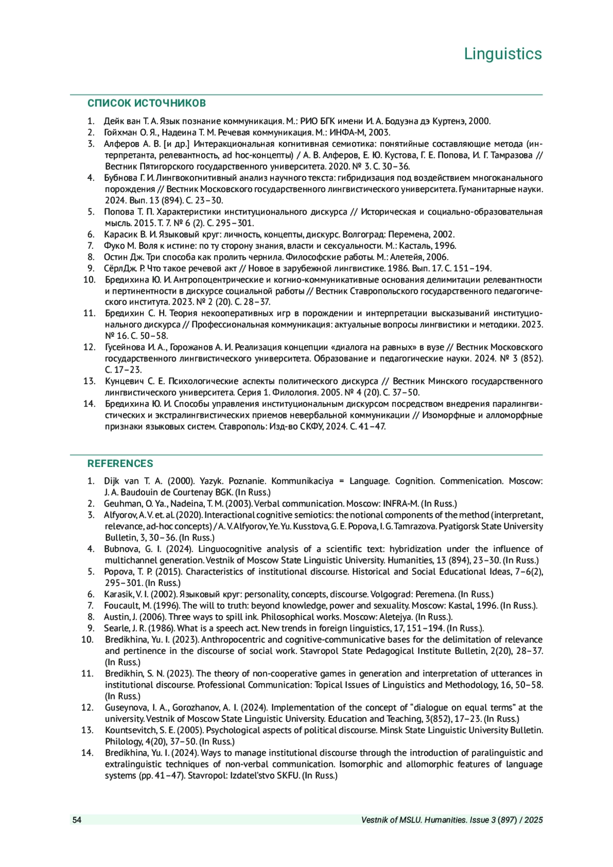 14. Бредихина Ю. И. Способы управления институциональным дискурсом посредством внедрения паралингвистических и экстралингвистических приемов невербальной коммуникации // Изоморфные и алломорфные признаки языковых систем. Ставрополь: Изд-во СКФУ, 2024. С. 41-47. EDN: PCKCTH