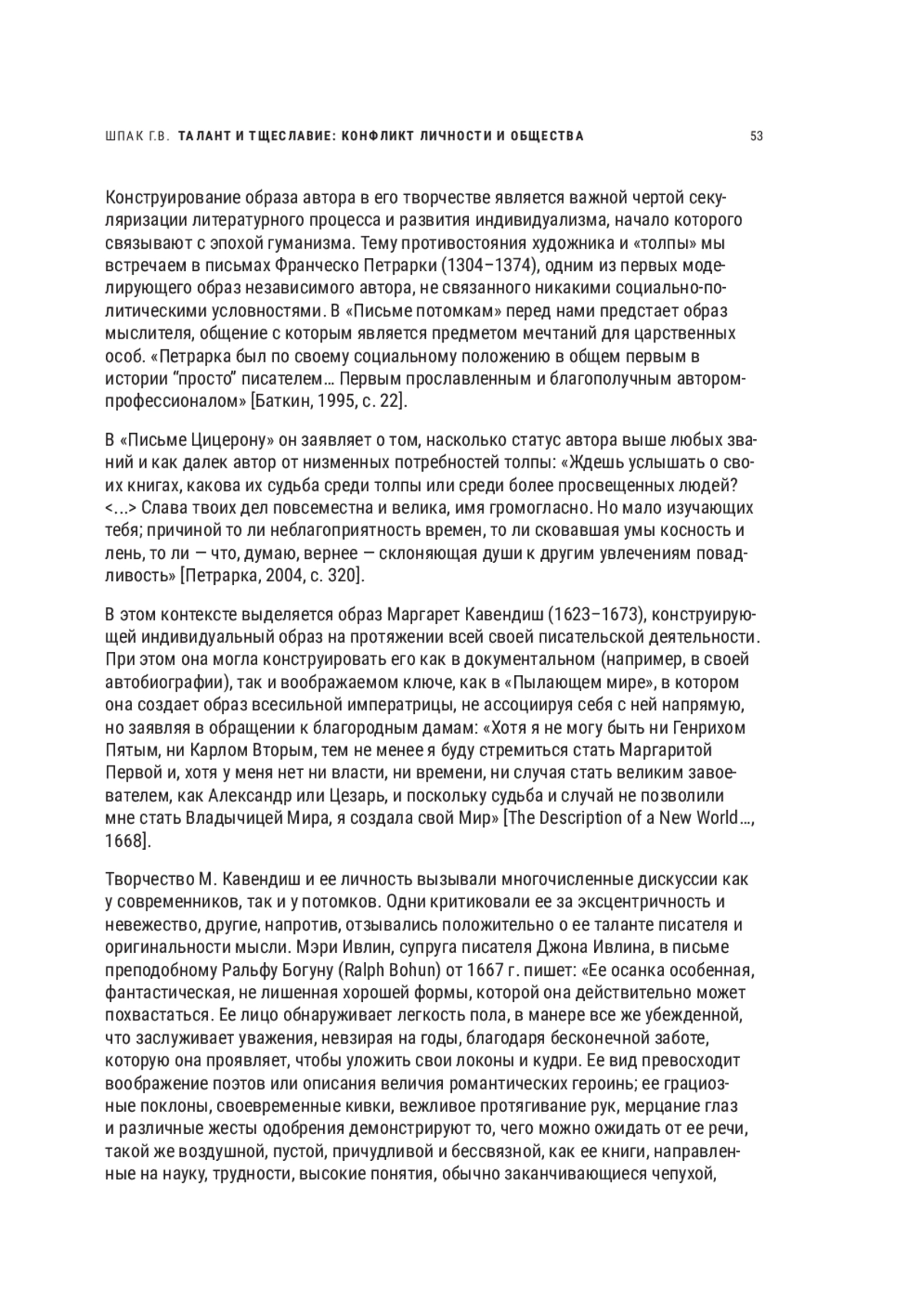 На протяжении раннего Нового времени авторы все больше внимания уделяют конструированию собственного образа. Примером может служить творчество Маргарет Кавендиш (1603–1673 гг.), активно использовавшей в своих трудах автобиографические зарисовки, рассуждающей о статусе автора и необходимой оригинальности его сочинений. Современники часто воспринимали ее стремление к оригинальности как проявление тщеславия и лицемерия. В статье будут рассмотрены примеры нарушения М. Кавендиш традиционных литературных форм, ее отношение к статусу индивидуальности и конструирование представления о научном знании как инструменте формирования независимой личности. Эпоха, в которой жила М. Кавендиш, накладывала ограничения как на творческие, так и личностные ее амбиции. В условиях, когда идеи абсолютизма порицались, М. Кавендиш создает свой воображаемый мир, в котором главенствуют один язык, одна вера и один правитель. Посвященных М. Кавендиш исследований на русском языке практически нет, как нет и переводов ее сочинений. При этом в ее работах раскрывается мировоззрение автора, вхожего в интеллектуальные круги своего времени, и прослеживается стремление сохранить свою индивидуальность. С целью решения конфликта личных устремлений и общественных условностей Маргарет создает в сочинении «Пылающий мир» свою собственную реальность и призывает всех активней использовать собственное воображение для трансформации неприглядного мира