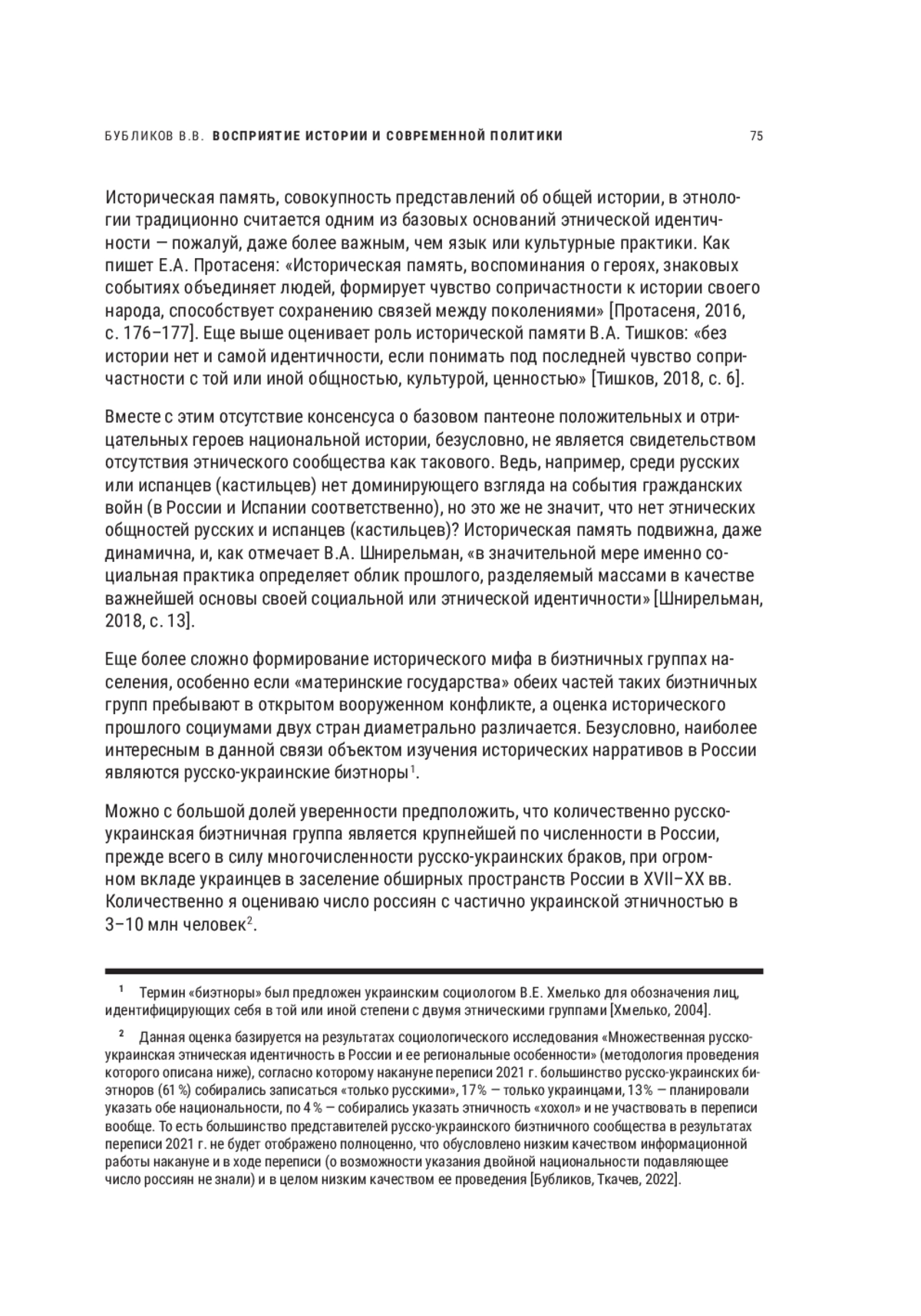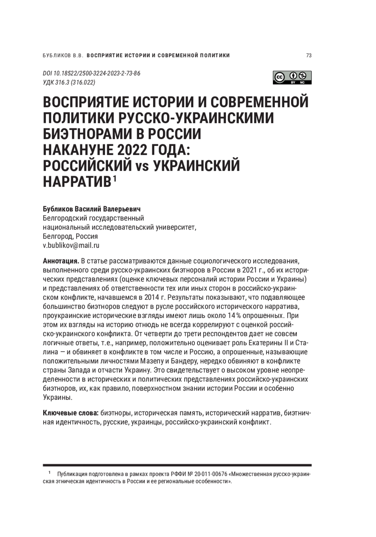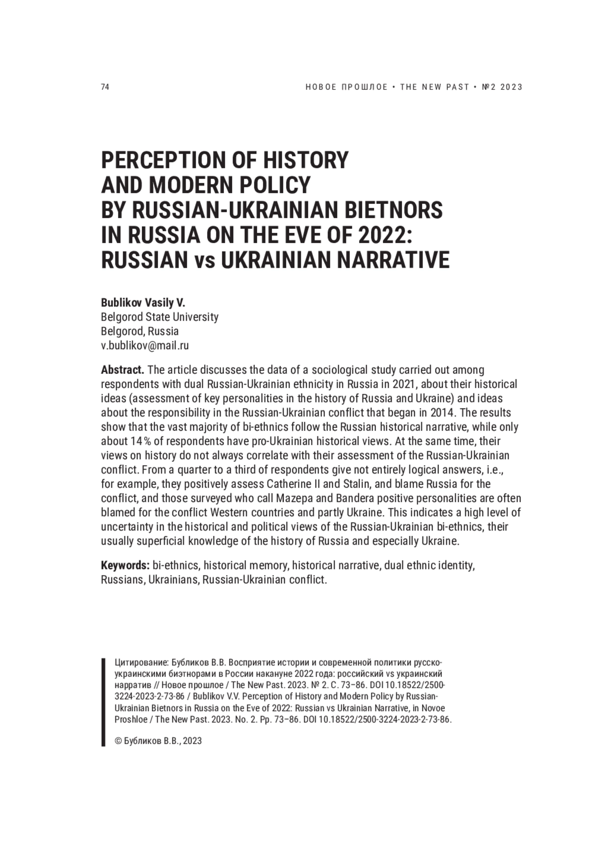 БУБЛИКОВ В. В. ВОСПРИЯТИЕ ИСТОРИИ И СОВРЕМЕННОЙ ПОЛИТИКИ РУССКО -УКРАИНСКИМИ БИЭТНОРАМИ В РОССИИ НАКАНУНЕ 2022 ГОДА: РОССИЙСКИЙ VS УКРАИНСКИЙ НАРРАТИВ // НОВОЕ ПРОШЛОЕ. 2023. № 2
