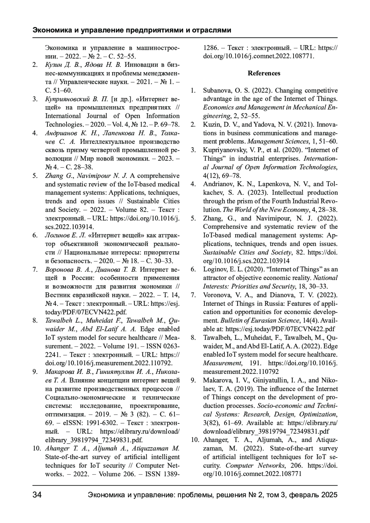 7. Воронова В. А., Дианова Т. В. Интернет вещей в России: особенности применения и возможности для развития экономики // Вестник евразийской науки. - 2022. - Т. 14, № 4. - Текст: электронный. - URL: https://esj.today/PDF/07ECVN422.pdf. EDN: HNHZYP
