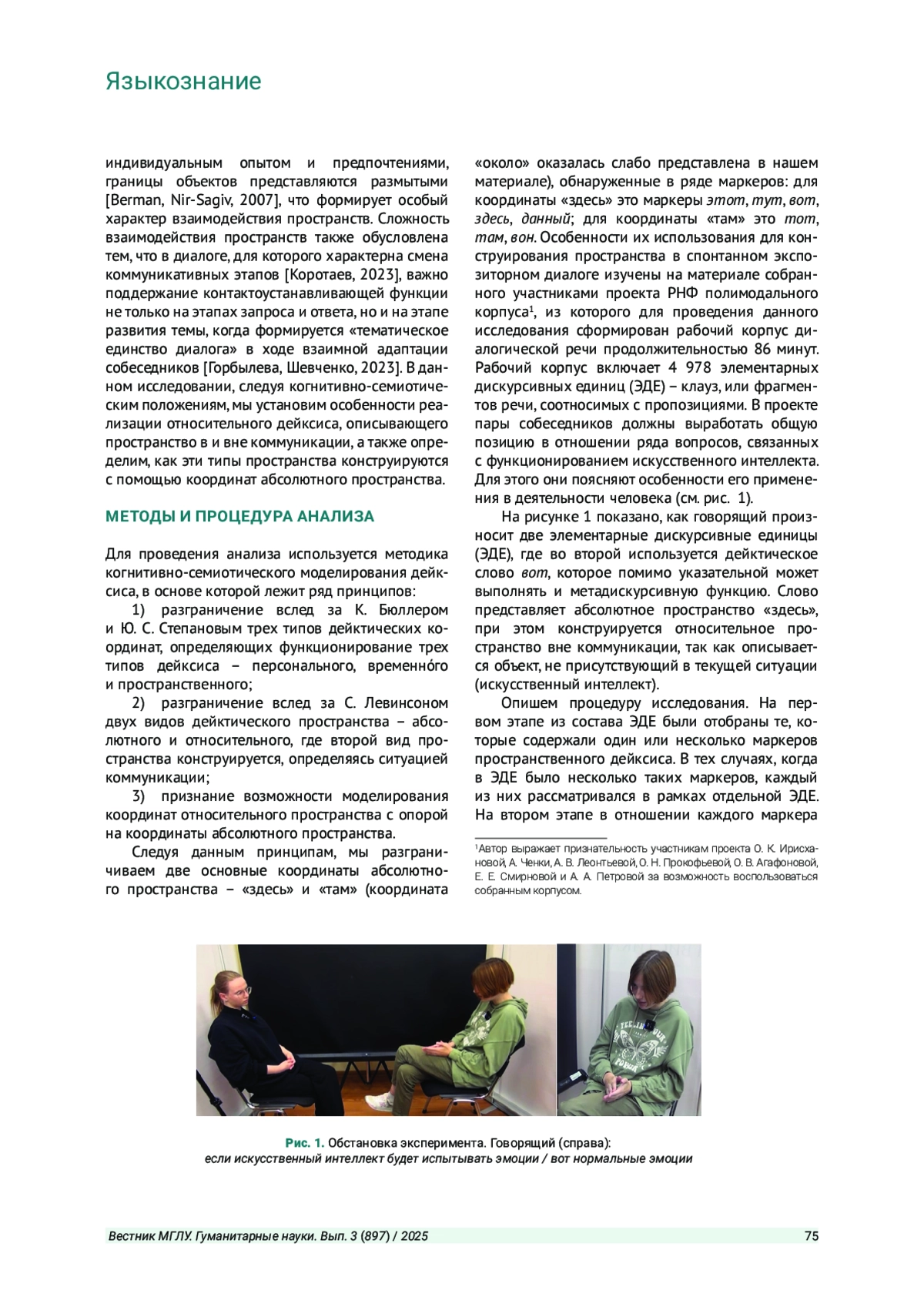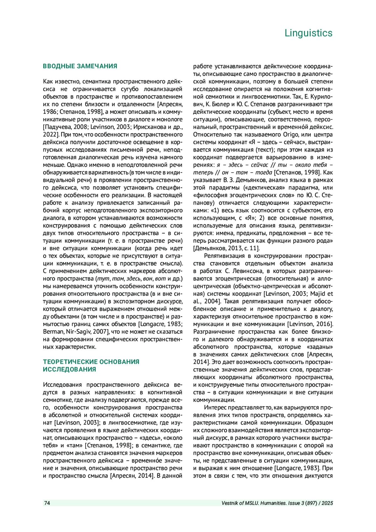 Как известно, семантика пространственного дейксиса не ограничивается сугубо локализацией объектов в пространстве и противопоставлением их по степени близости и отдаленности [Апресян, 1986; Степанов, 1998], а может описывать и коммуникативные роли участников в диалоге и монологе [Падучева, 2008; Levinson, 2003; Ирисханова и др., 2022].