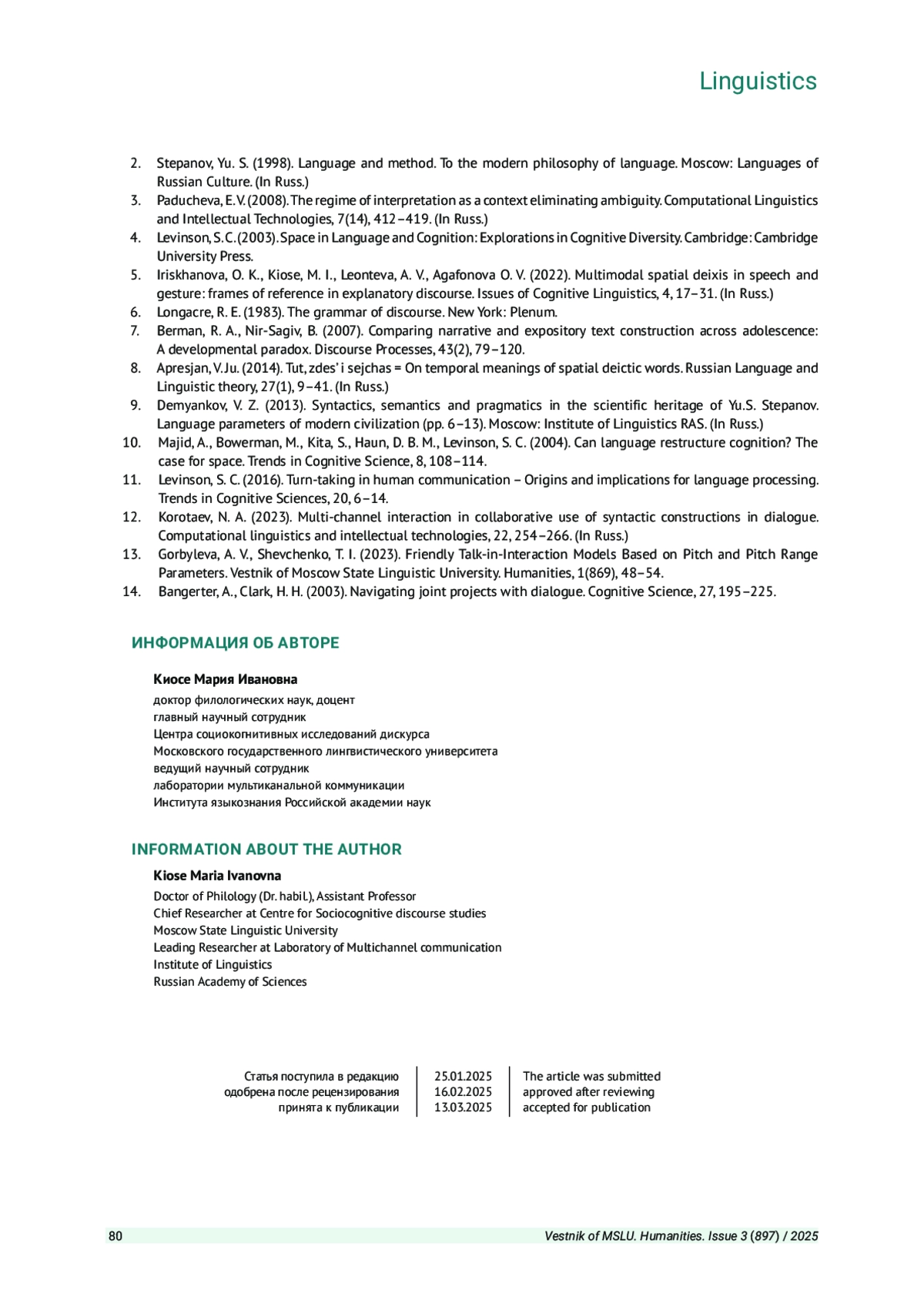 5. Ирисханова O. K. [и др.]. Полимодальный пространственный дейксис в речи и жестах: системы координат в экспланаторном дискурсе / O. K. Ирисханова, М. И. Киосе, A. В. Леонтьева, О. В. Агафонова // Вопросы когнитивной лингвистики. 2022. Вып. 4. С. 17-31. EDN: GCMSRK