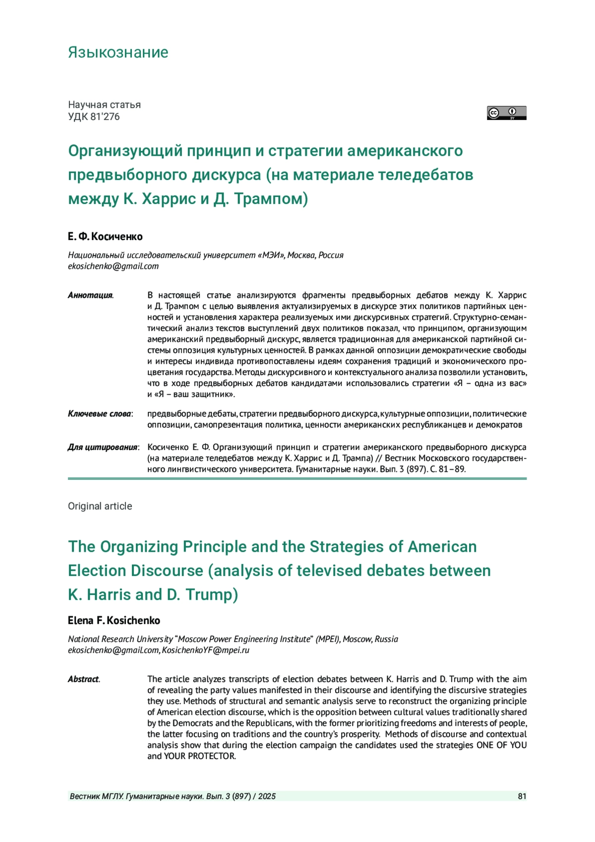 В настоящей статье анализируются фрагменты предвыборных дебатов между К. Харрис и Д. Трампом с целью выявления актуализируемых в дискурсе этих политиков партийных ценностей и установления характера реализуемых ими дискурсивных стратегий. Структурно-семантический анализ текстов выступлений двух политиков показал, что принципом, организующим американский предвыборный дискурс, является традиционная для американской партийной системы оппозиция культурных ценностей. В рамках данной оппозиции демократические свободы и интересы индивида противопоставлены идеям сохранения традиций и экономического процветания государства. Методы дискурсивного и контекстуального анализа позволили установить, что в ходе предвыборных дебатов кандидатами использовались стратегии «Я - одна из вас» и «Я - ваш защитник».