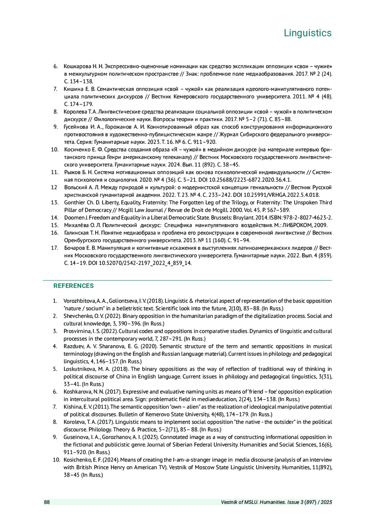 6. Кошкарова Н. Н. Экспрессивно-оценочные номинации как средство экспликации оппозиции “свои - чужие” в межкультурном политическом пространстве // Знак: проблемное поле медиаобразования. 2017. № 2 (24). С. 134-138. EDN: YRGIFJ