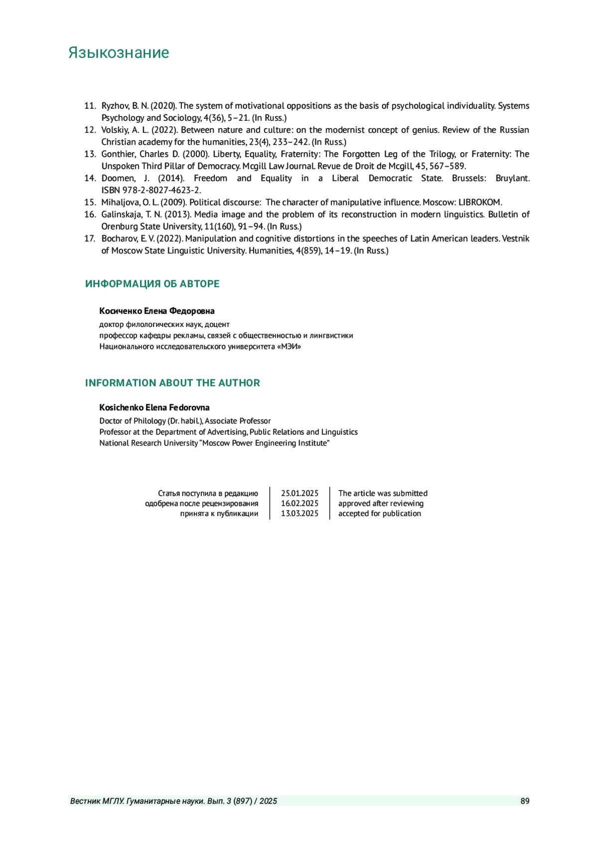 17. Бочаров Е. В. Манипуляция и когнитивные искажения в выступлениях латиноамериканских лидеров // Вестник Московского государственного лингвистического университета. Гуманитарные науки. 2022. Вып. 4 (859). С. 14-19. DOI: 10.52070/2542-2197_2022_4_859_14 EDN: MLZVLV