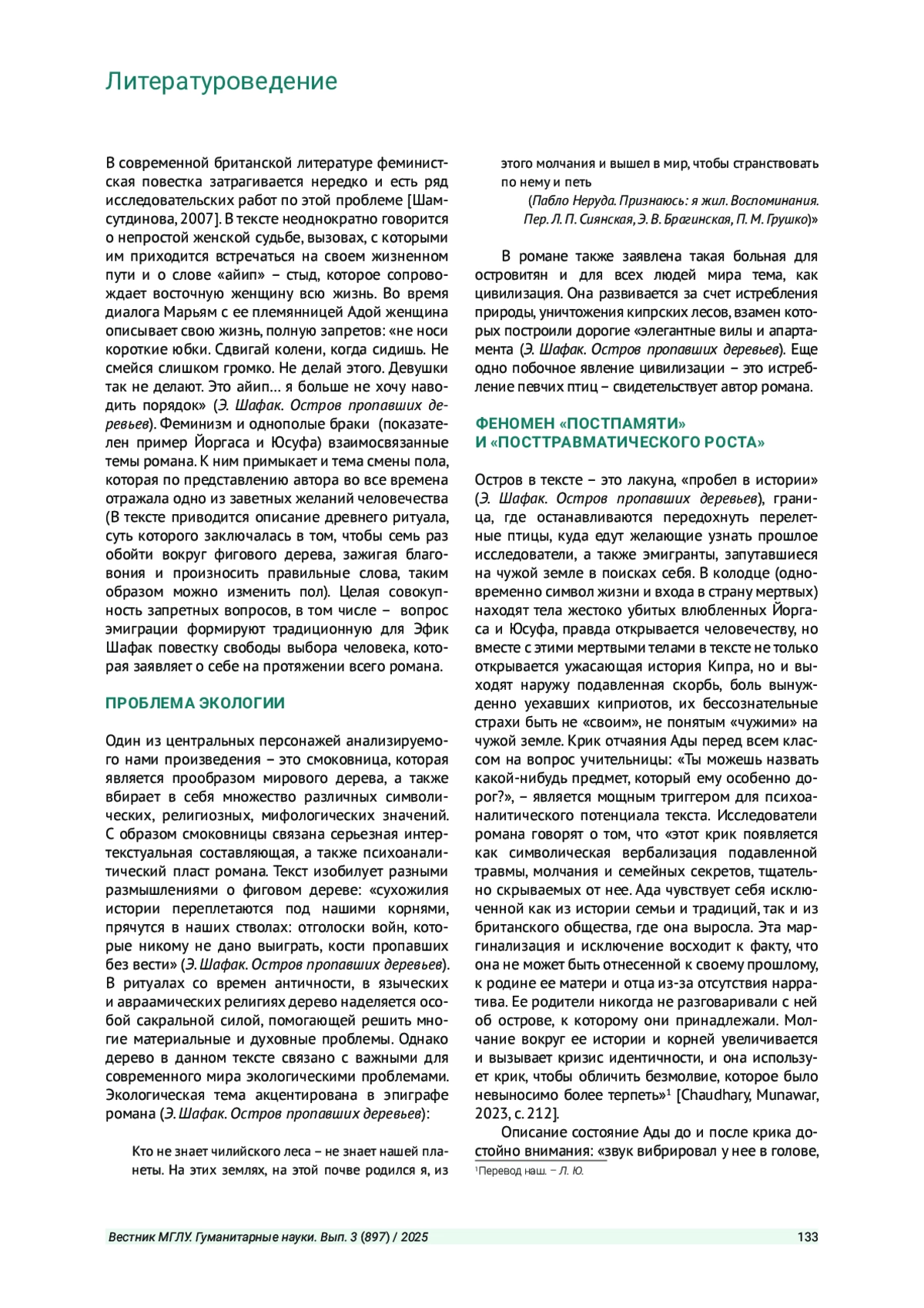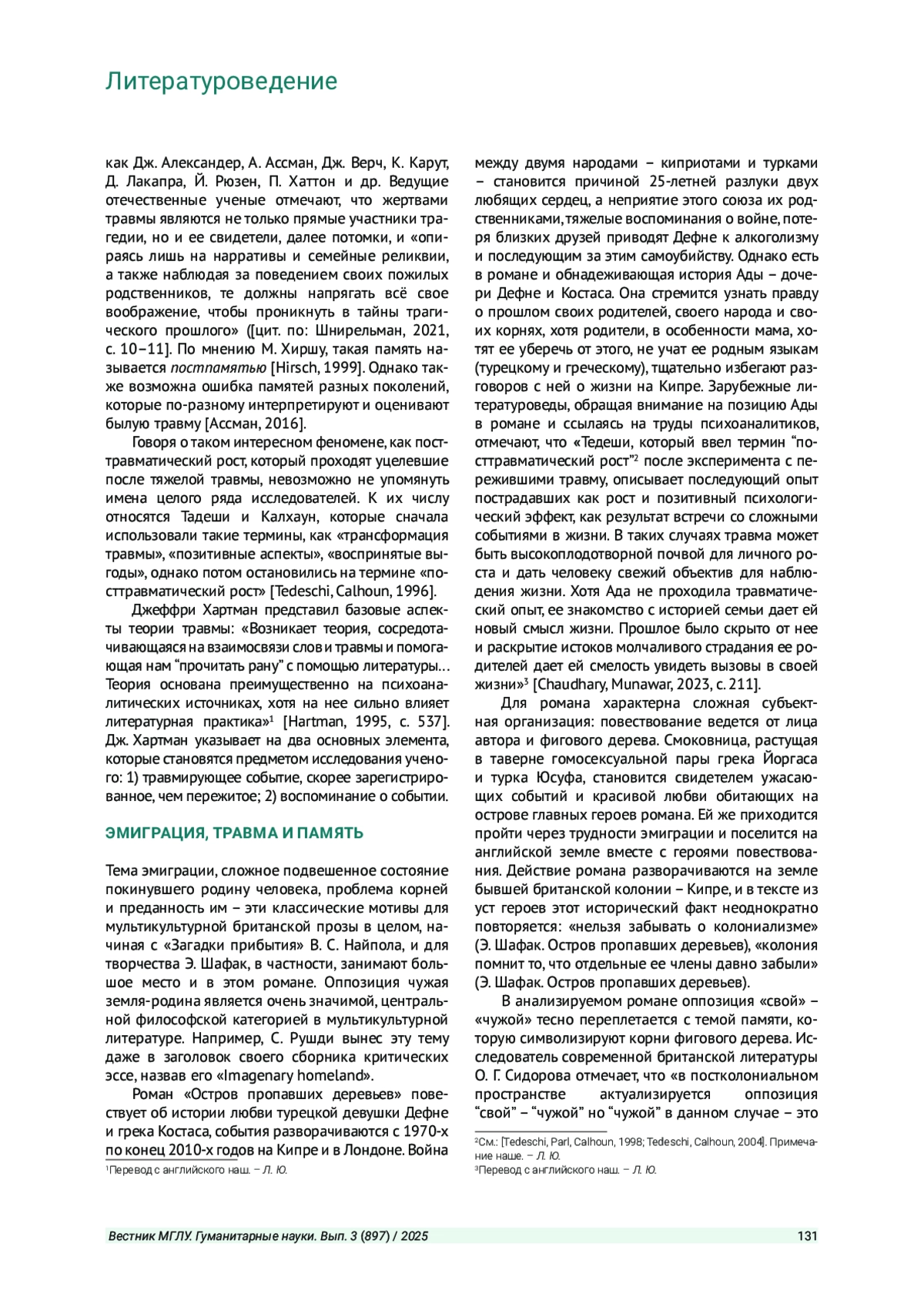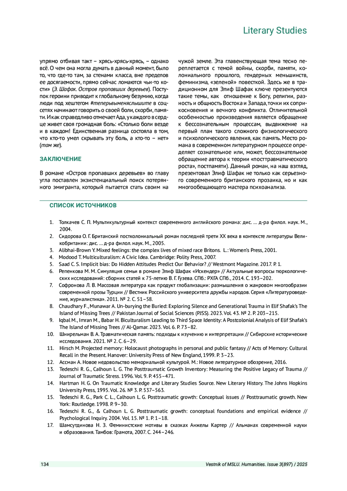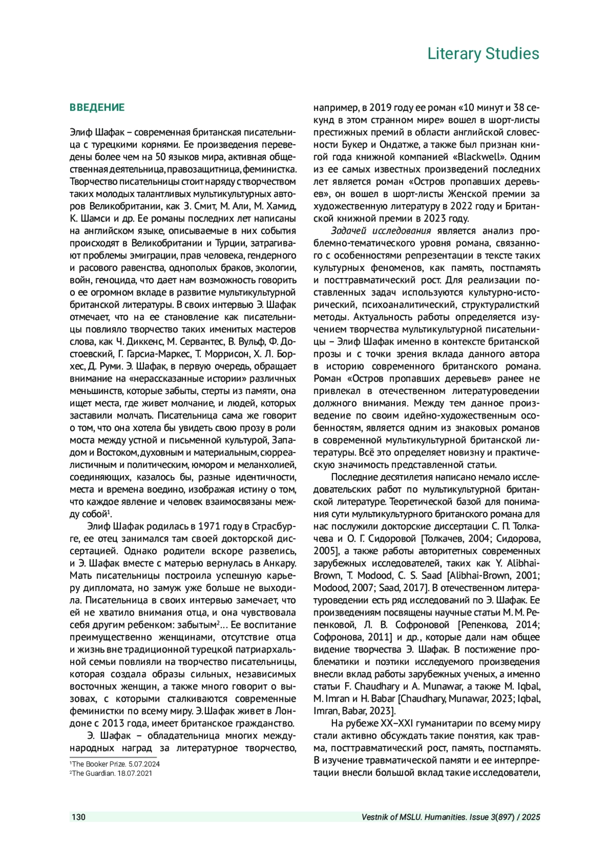 8. Chaudhary F., Munawar A. Un-burying the Buried: Exploring Silence and Generational Trauma in Elif Shafak’s The Island of Missing Trees // Pakistan Journal of Social Sciences (PJSS). 2023. Vol. 43. № 2. P. 203-215.