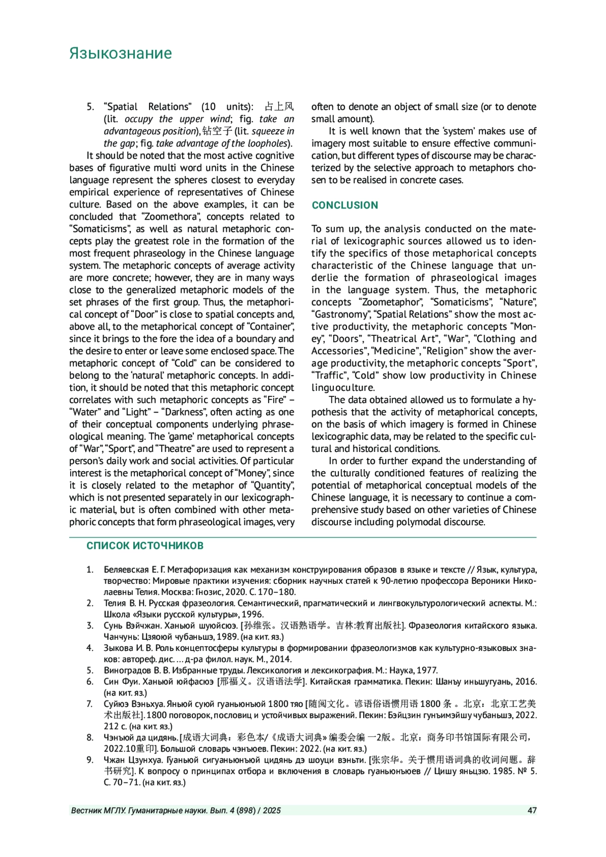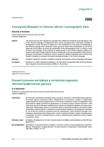 В статье рассматриваются метафорические концепты, лежащие в основе образования фразеологических единиц китайского языка. Определяется их активность, исходя из информации, предоставленной лексикографическими источниками. Отправной точкой исследования стало рассмотрение сферы применения фразеологии в китайском языке, которая включает в себя различные группы устойчивых словосочетаний. Целью исследования является уточнение классификации сверхсловных единиц в китайском языке, а также рассмотрение принципов отбора устойчивых словосочетаний в китайской лингвистической традиции. Исследование показывает, что китайские лингвисты стремятся сочетать структурные и семантические критерии классификации фразеологизмов. Предпринята попытка проанализировать модели метафоризации и наиболее частотные метафорические концепты, формирующие фразеологические образы в китайском языке.