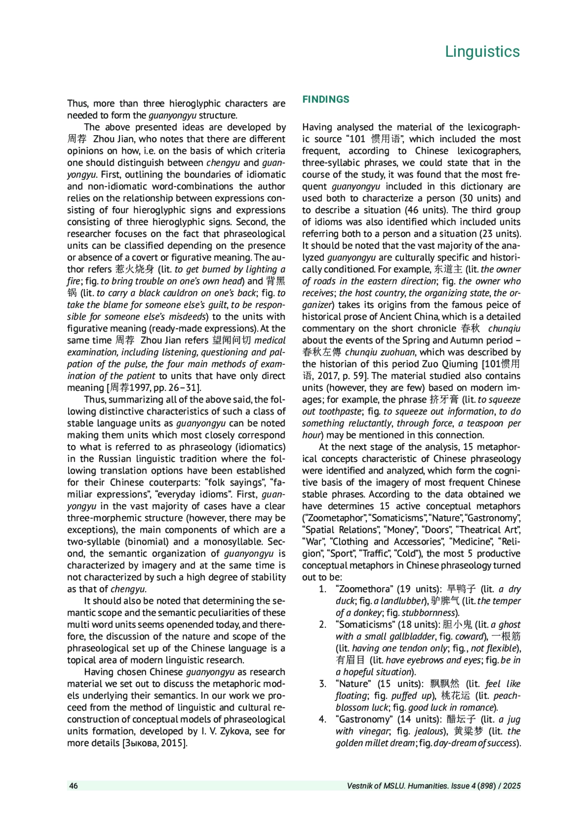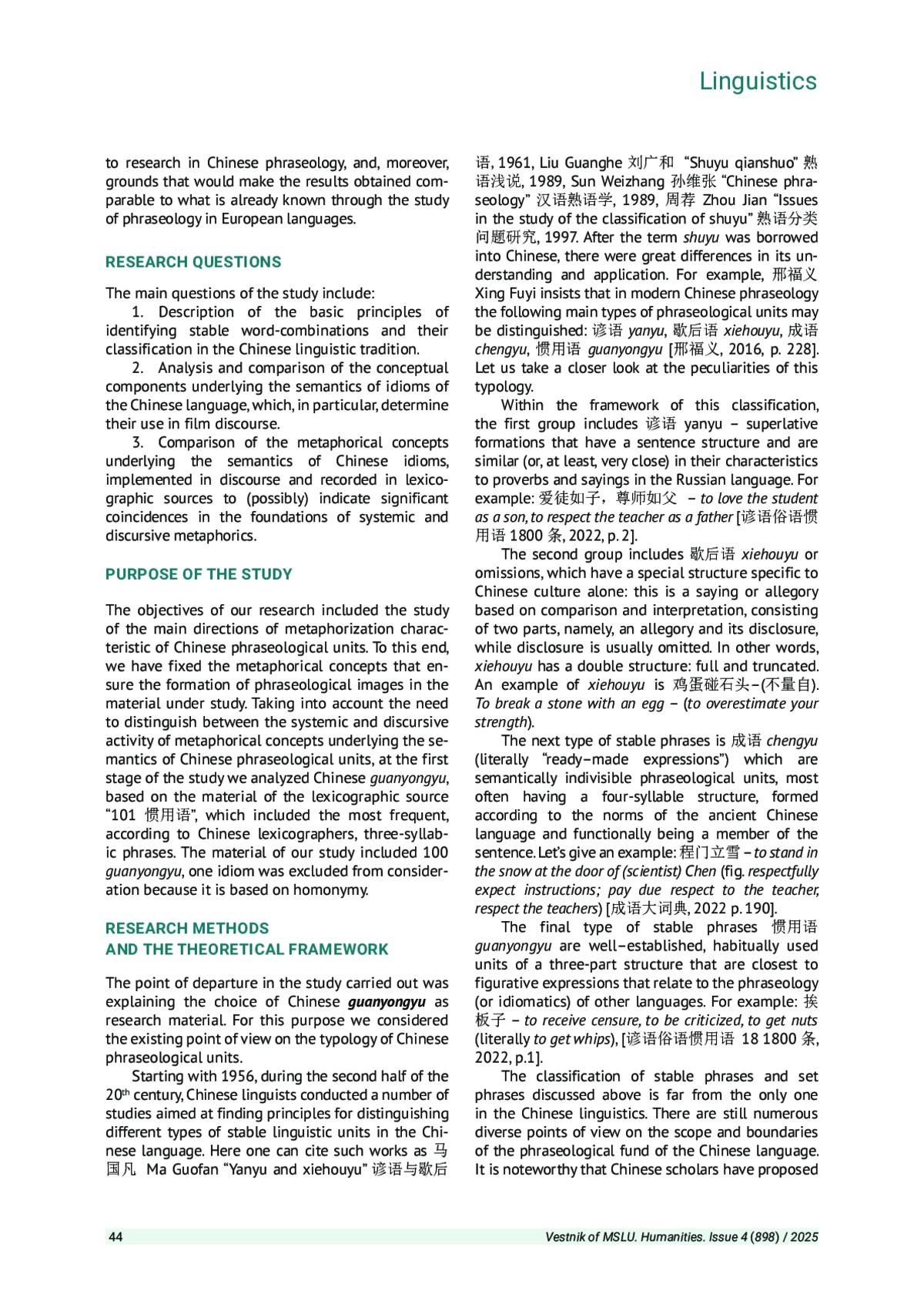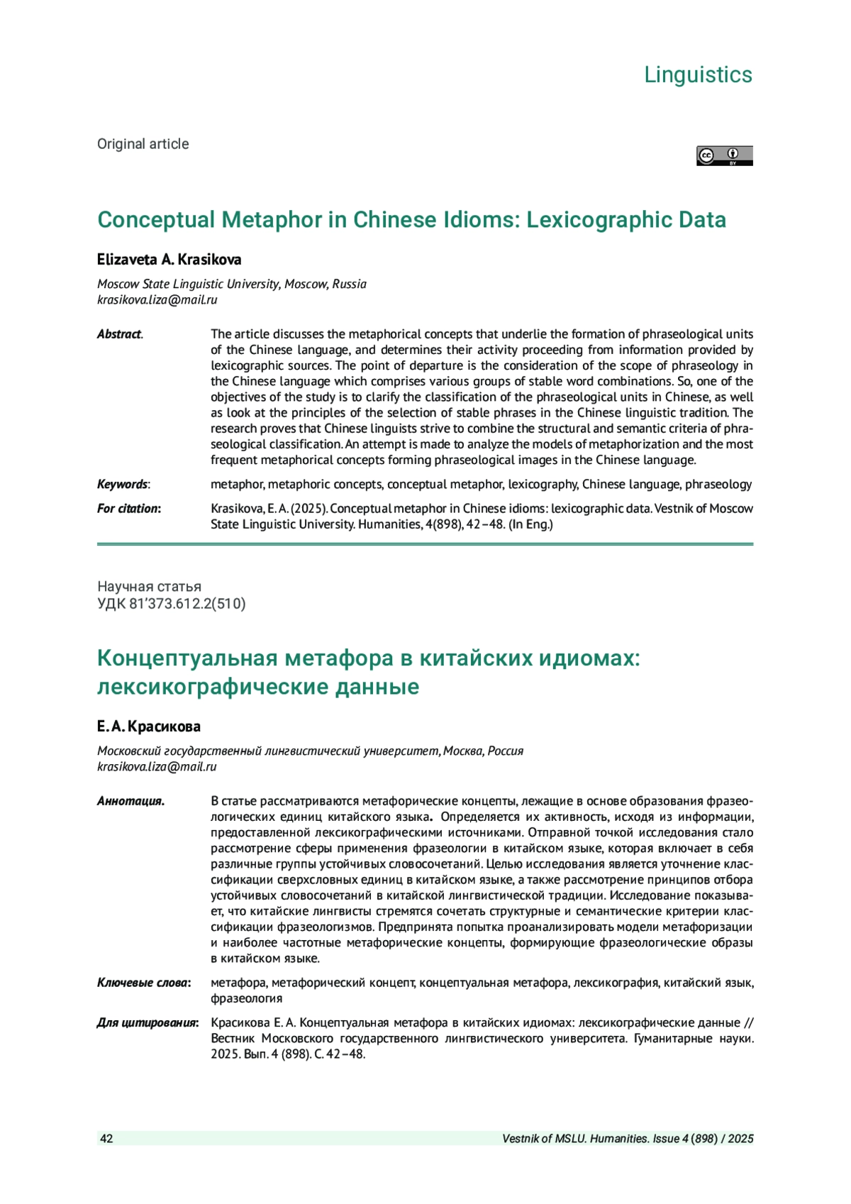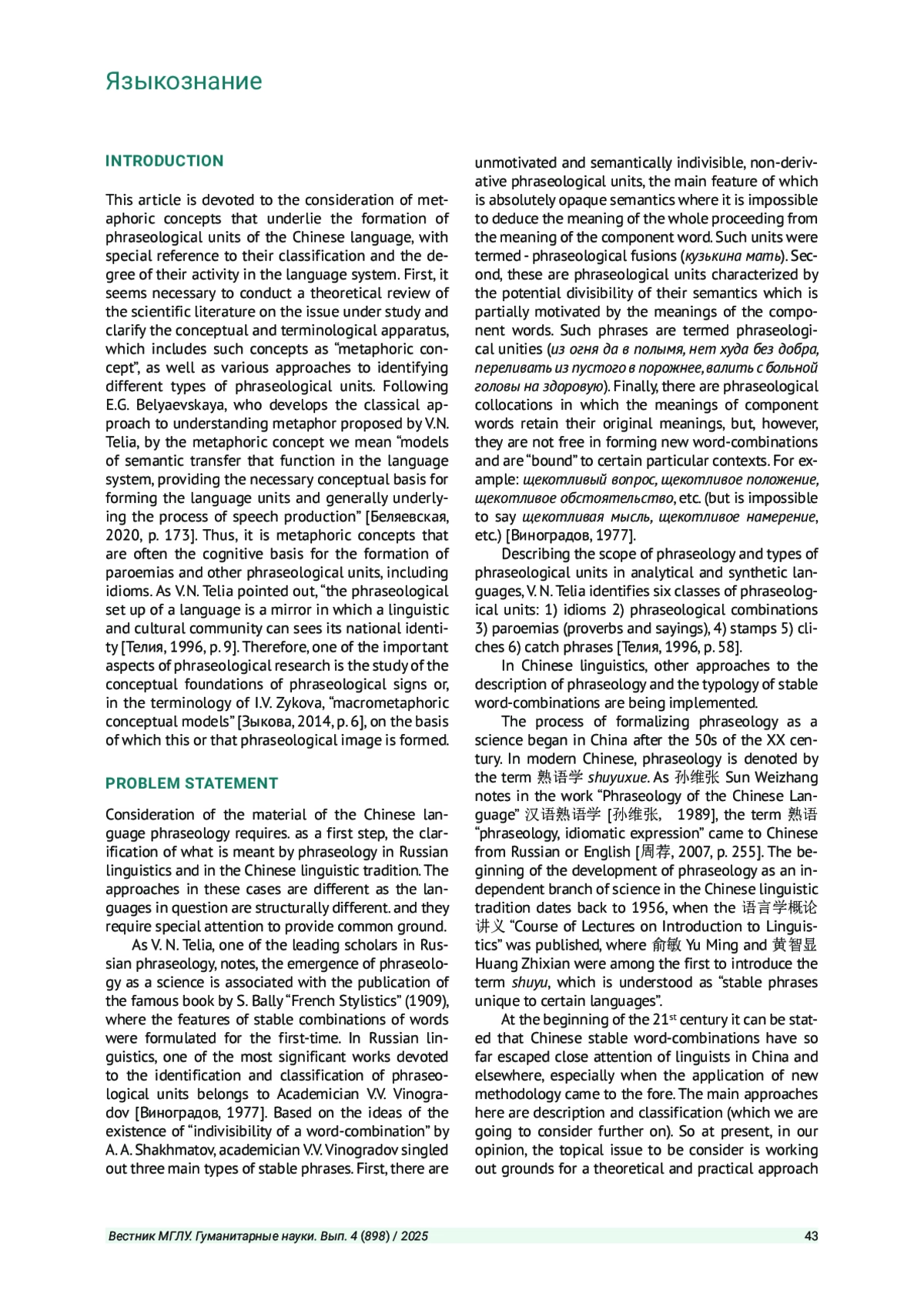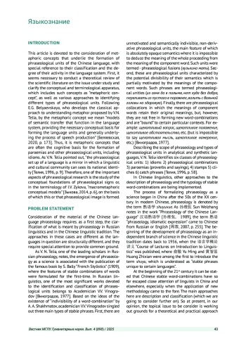 This article is devoted to the consideration of metaphoric concepts that underlie the formation of phraseological units of the Chinese language, with special reference to their classification and the degree of their activity in the language system. First, it seems necessary to conduct a theoretical review of the scientific literature on the issue under study and clarify the conceptual and terminological apparatus, which includes such concepts as “metaphoric concept”, as well as various approaches to identifying different types of phraseological units.