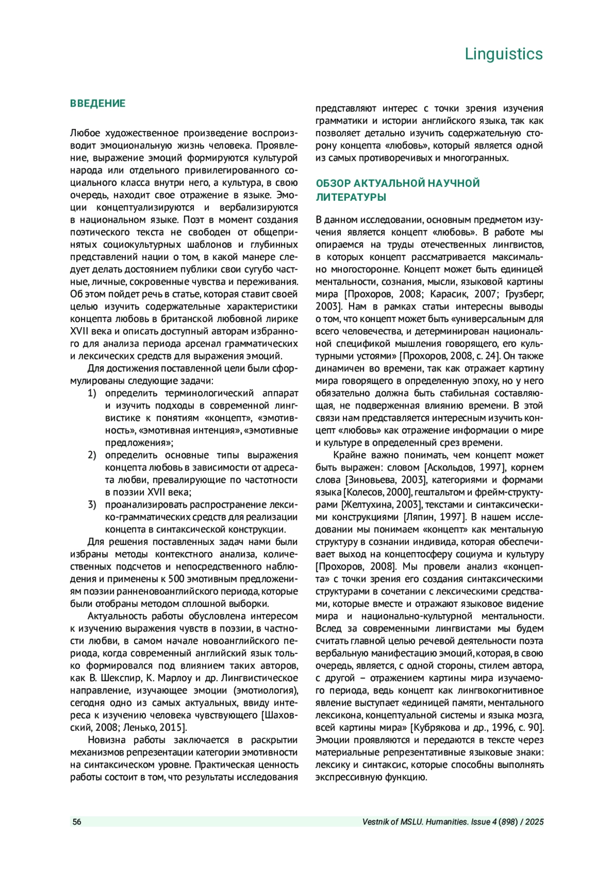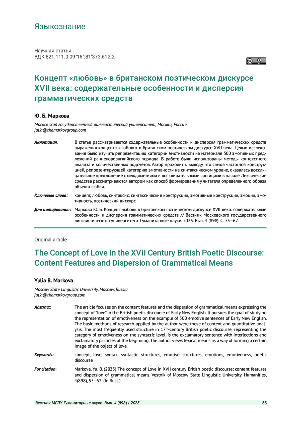 В статье рассматриваются содержательные особенности и дисперсия грамматических средств выражения концепта «любовь» в британском поэтическом дискурсе XVII века. Целью исследования было изучить репрезентацию категории эмотивности на материале 500 эмотивных предложений ранненовоанглийского периода. В работе были использованы методы контекстного анализа и количественных подсчетов. Автор приходит к выводу, что самой частотной конструкцией, репрезентирующей категорию эмотивности на синтаксическом уровне, оказалась восклицательное предложение с междометиями и восклицательными частицами в начале. Лексические средства рассматриваются автором как способ формирования у читателя определенного образа объекта любви.