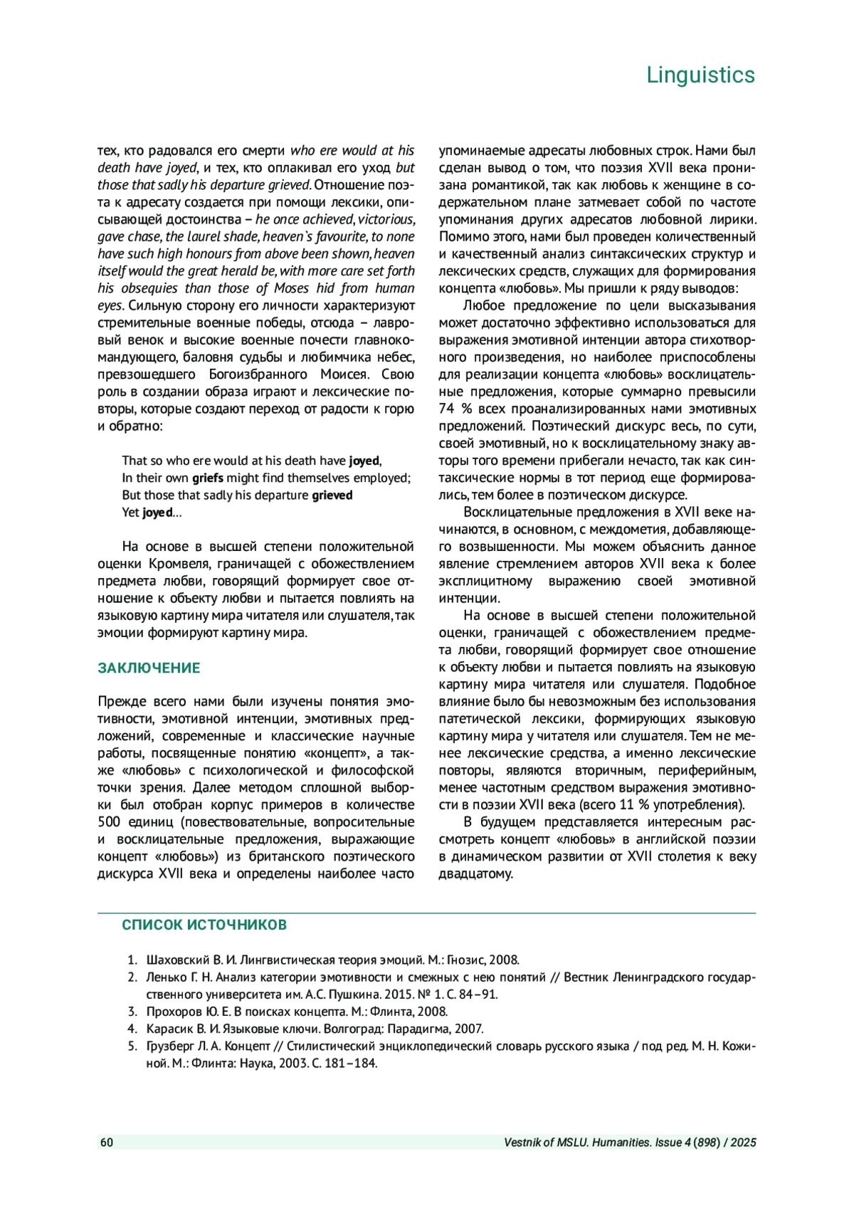 2. Ленько Г. Н. Анализ категории эмотивности и смежных с нею понятий // Вестник Ленинградского государственного университета им. А.С. Пушкина. 2015. № 1. C. 84-91. EDN: UAORSF