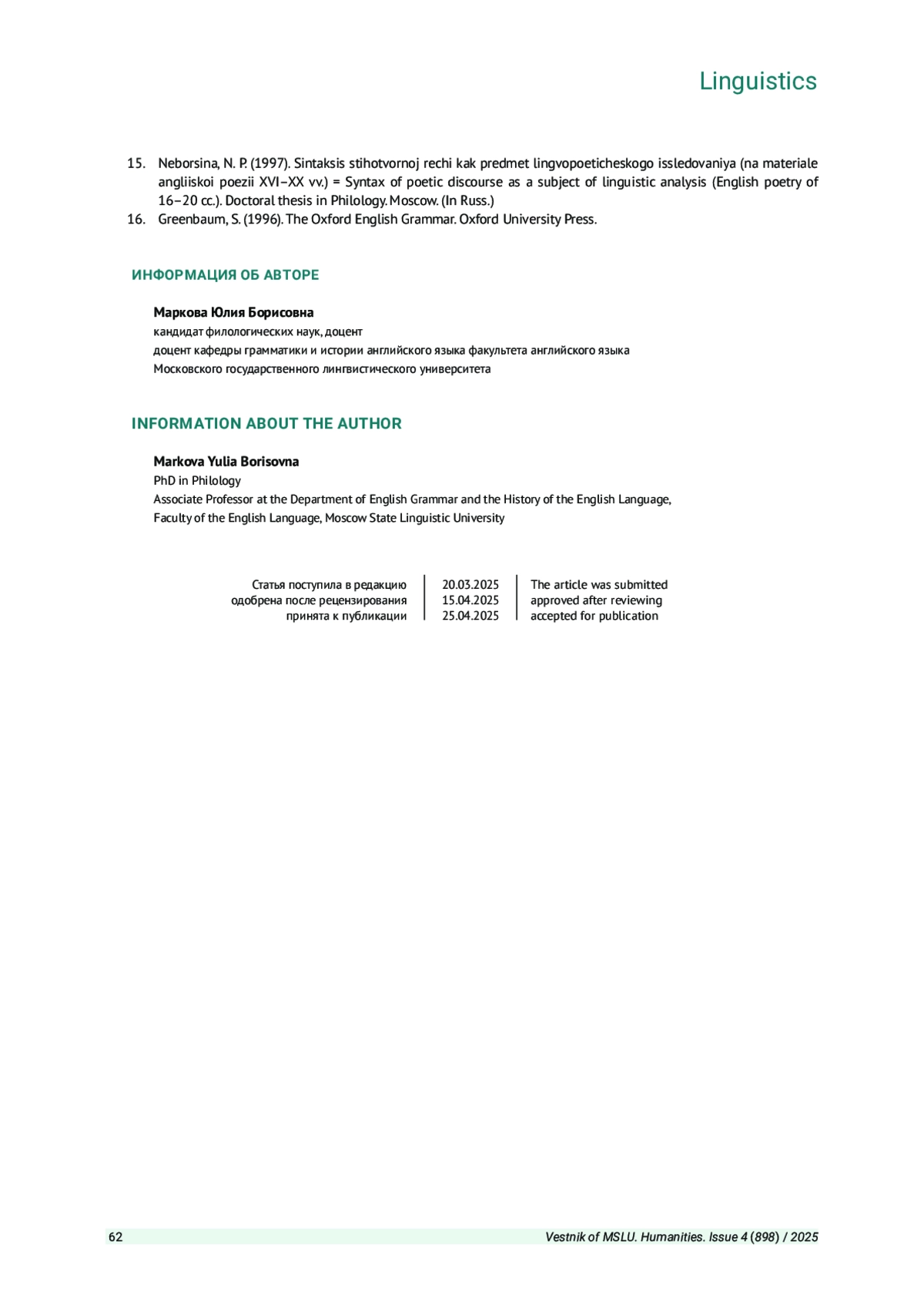 15. Неборсина Н.П. Синтаксис стихотворной речи как предмет лингвопоэтического исследования (на материале английской поэзии XVI-XX вв.): дис. … д-ра филол. наук. М., 1997.