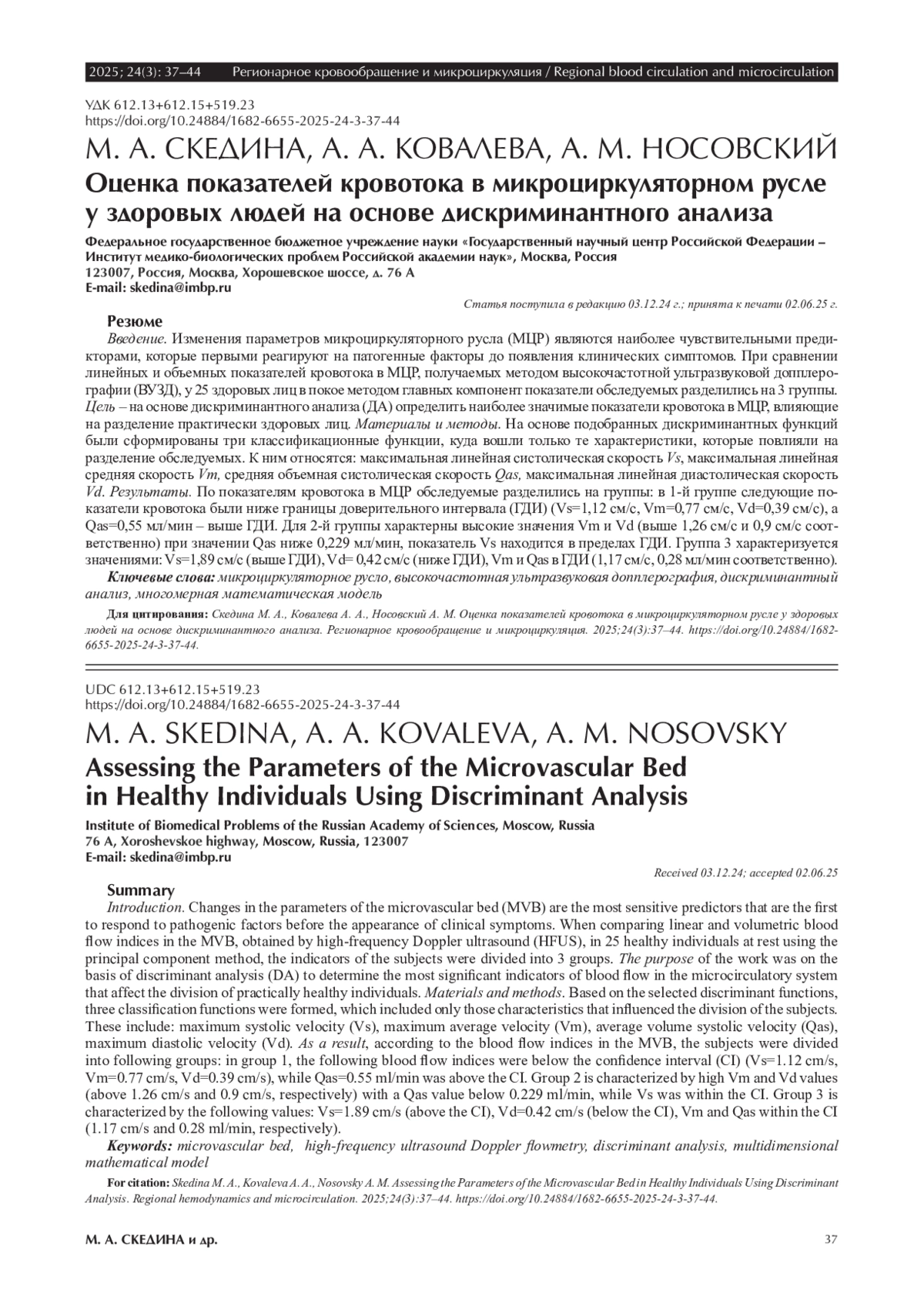 Введение. Изменения параметров микроциркуляторного русла (МЦР) являются наиболее чувствительными предикторами, которые первыми реагируют на патогенные факторы до появления клинических симптомов. При сравнении линейных и объемных показателей кровотока в МЦР, получаемых методом высокочастотной ультразвуковой допплерографии (ВУЗД), у 25 здоровых лиц в покое методом главных компонент показатели обследуемых разделились на 3 группы. Цель – на основе дискриминантного анализа (ДА) определить наиболее значимые показатели кровотока в МЦР, влияющие на разделение практически здоровых лиц. Материалы и методы. На основе подобранных дискриминантных функций были сформированы три классификационные функции, куда вошли только те характеристики, которые повлияли на разделение обследуемых. К ним относятся: максимальная линейная систолическая скорость Vs, максимальная линейная средняя скорость Vm, средняя объемная систолическая скорость Qas, максимальная линейная диастолическая скорость Vd. Результаты. По показателям кровотока в МЦР обследуемые разделились на группы: в 1-й группе следующие показатели кровотока были ниже границы доверительного интервала (ГДИ) (Vs=1,12 см/с, Vm=0,77 см/с, Vd=0,39 см/с), а Qas=0,55 мл/ мин – выше ГДИ. Для 2-й группы характерны высокие значения Vm и Vd (выше 1,26 см/с и 0,9 см/с соответственно) при значении Qas ниже 0,229 мл/мин, показатель Vs находится в пределах ГДИ. Группа 3 характеризуется значениями: Vs=1,89 см/с (выше ГДИ), Vd= 0,42 см/с (ниже ГДИ), Vm и Qas в ГДИ (1,17 см/с, 0,28 мл/мин соответственно).