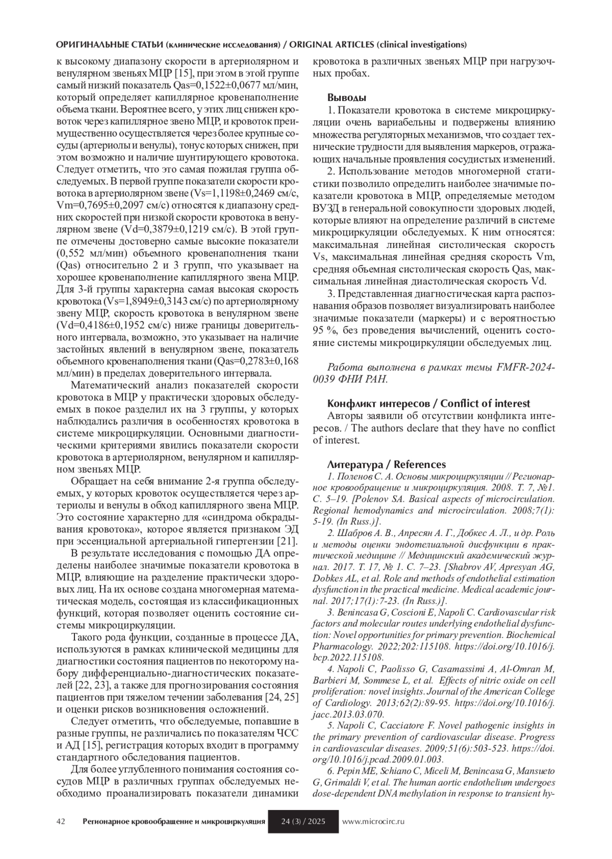 15. Скедина M. A., Ковалева А. А., Носовский А. М. Анализ показателей кровотока в микроциркуляторном русле кожи человека и их связь с показателями центральной гемодинамики // Регионарное кровообращение и микроциркуляция. 2020. Т. 19, №4. C. 76-86.