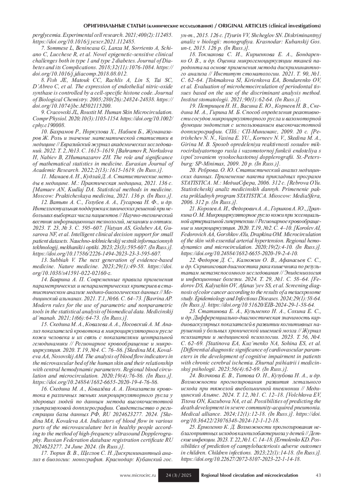 16. Скедина М. А., Ковалёва А. А. Показатели кровотока в различных звеньях микроциркуляторного русла у здоровых людей по данным метода высокочастотной ультразвуковой допплерографии. Свидетельство о регистрации базы данных РФ, RU 2024623277. 2024.