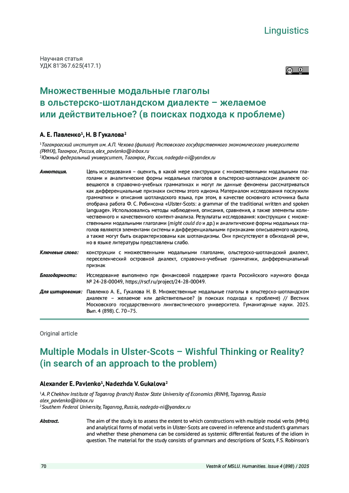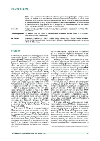 Цель исследования - оценить, в какой мере конструкции с множественными модальными глаголами и аналитические формы модальных глаголов в ольстерско-шотландском диалекте освещаются в справочно-учебных грамматиках и могут ли данные феномены рассматриваться как дифференциальные признаки системы этого идиома. Материалом исследования послужили грамматики и описания шотландского языка, при этом, в качестве основного источника была отобрана работа Ф. С. Робинсона «Ulster-Scots: a grammar of the traditional written and spoken language». Использовались методы наблюдения, описания, сравнения, а также элементы количественного и качественного контент-анализа. Результаты исследования: конструкции с множественными модальными глаголами (might could do и др.) и аналитические формы модальных глаголов являются элементами системы и дифференциальными признаками описываемого идиома, а также могут быть охарактеризованы как шотландизмы. Они присутствуют в обиходной речи, но в языке литературы представлены слабо.