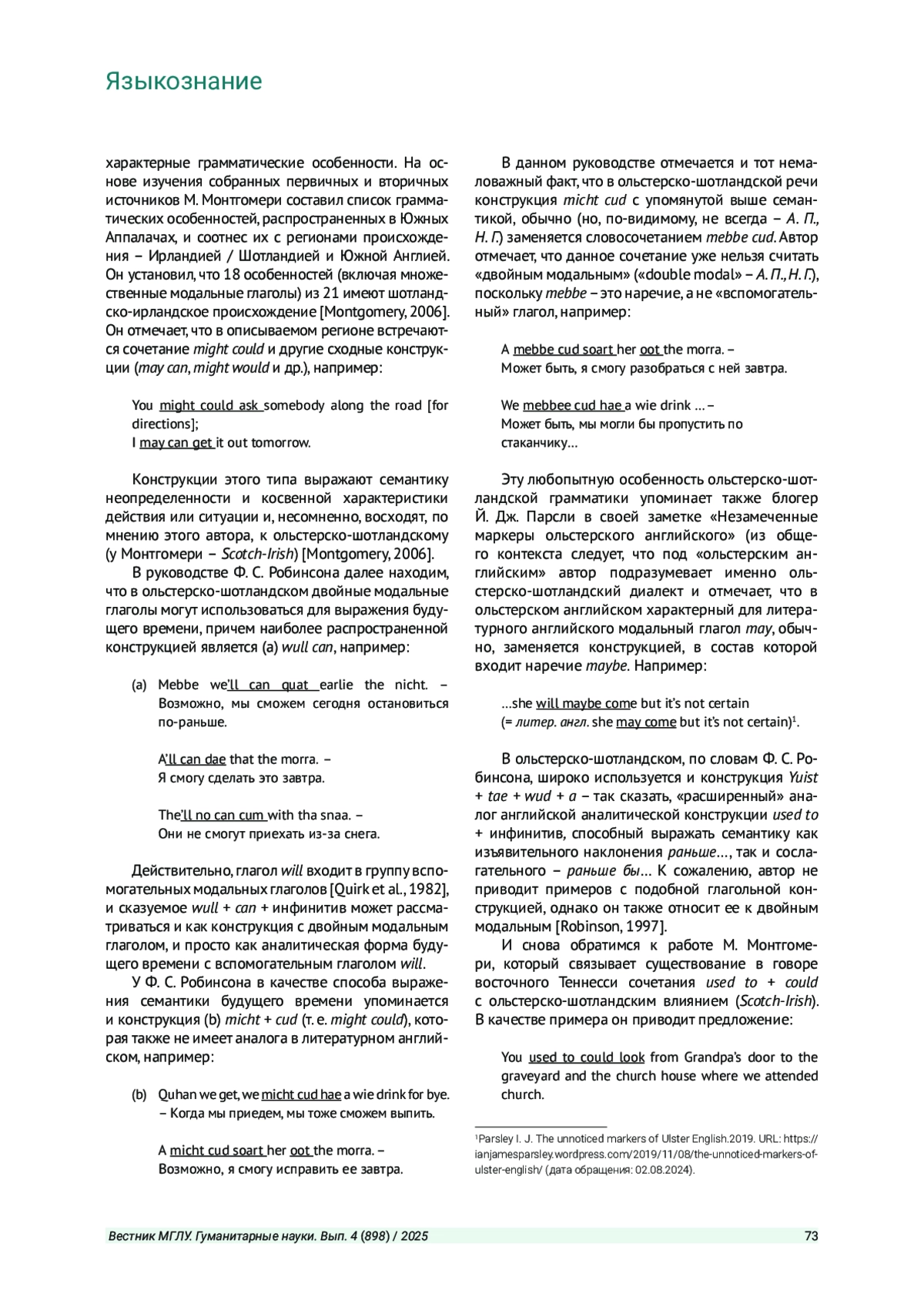 5. Montgomery M. B., Nagle S. J. Double Modals in Scotland and the Southern United States: Transatlantic Inheritance or Independent Development? // Folia Linguistica Historica XIV/1-2. Walter de Gruyter: Berlin - Boston. 1993. P. 91-107.