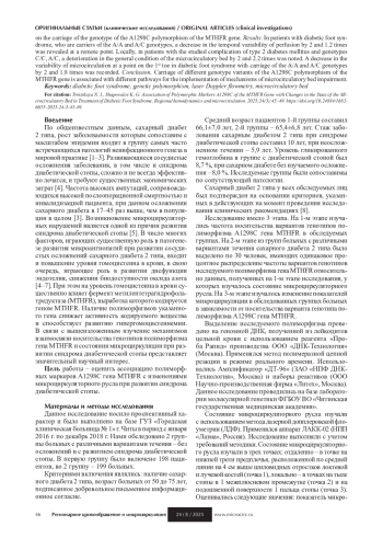 Введение. Сахарный диабет 2 типа занимает лидирующие позиции в структуре заболеваний неинфекционного происхождения в мире. Развитие тяжелых сосудистых осложнений заболевания, к которым относится синдром диабетической стопы, требует сложного лечения и является экономически затратным процессом, сопровождающимся высокой инвалидизацией и смертностью больных. Цель – оценить ассоциацию полиморфных маркеров A1298C гена MTHFR с изменениями микроциркуляторного русла при развитии диабетической стопы. Материалы и методы. На 1-м этапе исследования у 198 пациентов с неосложненным сахарным диабетом 2 типа и 199 пациентов с диабетической стопой изучали распределение генотипов полиморфизма A1298C гена MTHFR. На 2-м этапе исследования из общих групп больных выделили по 30 человек с сопоставимым в процентном соотношении распределением частот изучаемого полиморфизма как на 1-м этапе, у которых исследовали состояние микроциркуляции методом лазерной допплеровской флоуметрии. На 3-м этапе исследования проанализированы показатели микроциркуляции в зависимости от носительства генотипа полиморфизма A1298C гена MTHFR. Результаты. У больных с синдромом диабетической стопы, носителей генотипов А/А и А/C, в отдаленной точке выявлено уменьшение временной изменчивости перфузии в 2 и 1,2 раза. Локально у пациентов с изучаемым осложнением сахарного диабета 2 типа и генотипами С/C, А/C отмечается ухудшение общего состояния микроциркуляторного русла в 2 и 2,2 раза. Зарегистрировано снижение вариабельности микрокровотока в точке на 1 пальце стопы при синдроме диабетической стопы с носительством генотипов А/А и А/C в 2 и 1,8 раза. Заключение. Носительство разных вариантов генотипов полиморфизма A1298C гена MTHFR ассоциировано с разными путями реализации механизмов нарушения состояния микроциркуляторного русла.