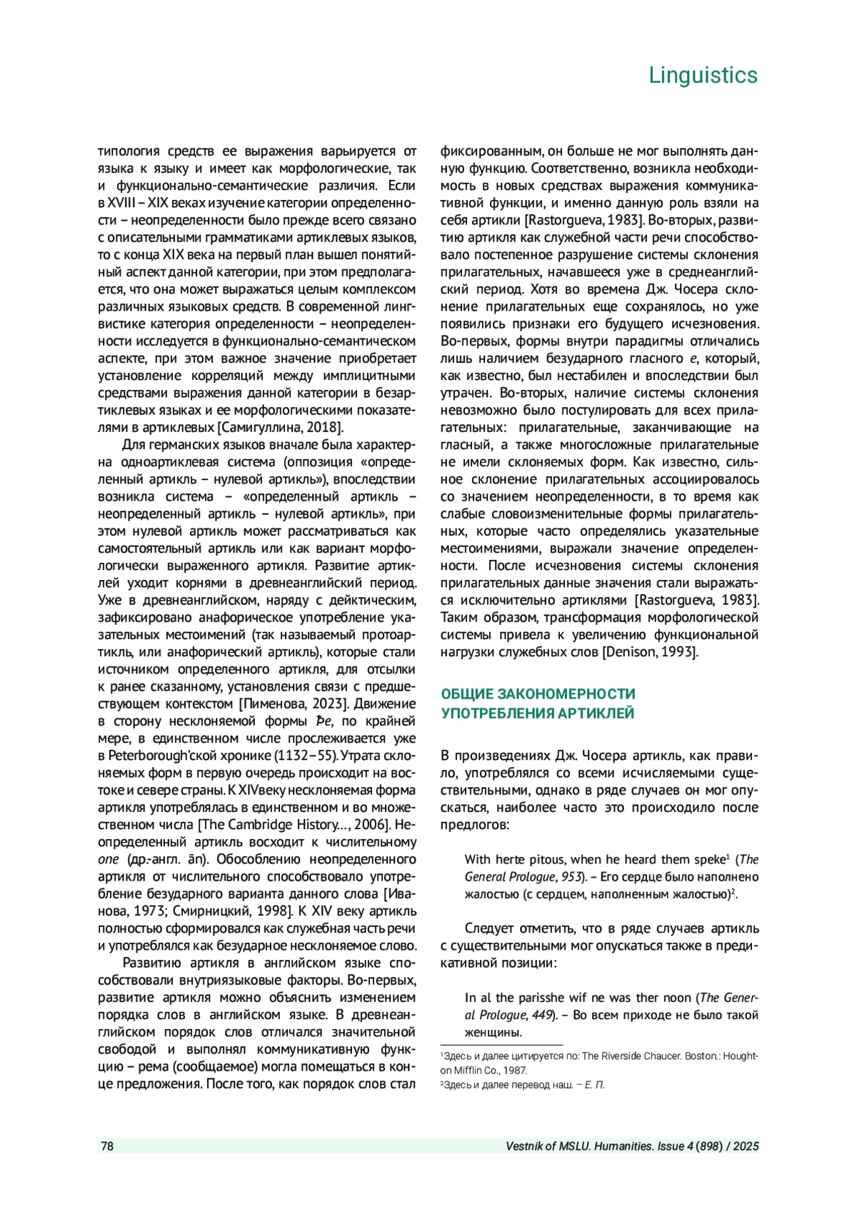 Целью исследования является изучение развития артикля как служебной части речи в истории английского языка, в частности, сравнение особенностей употребления артиклей в произведениях классического среднеанглийского периода с современными закономерностями. Основными методами исследования выступили функционально-семантический анализ и сравнительный анализ. Материалом для анализа послужили «Кентерберийские рассказы» Дж. Чосера. В статье проводится сравнительный анализ семантических функций артиклей в среднеанглийский и современный периоды. Особое внимание уделяется особенностям употребления артиклей с различными семантическими группами существительных и их сопоставлению с нормами, закрепившимися в современном английском языке.