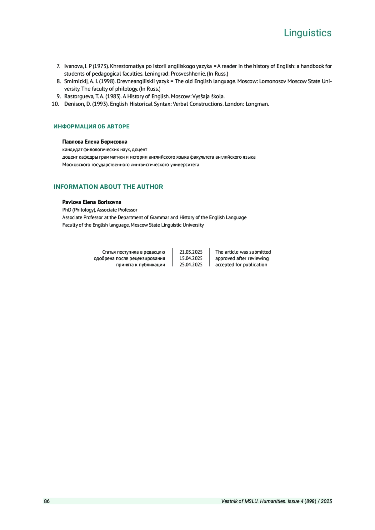 5. Пименова Н. Б. Предартиклевые употребления протоартикля se в древнеанглийском языке // Acta Linguistica Petropolitana. 2023. Vol. 19.1. P. 230-255. EDN: AWLNSV