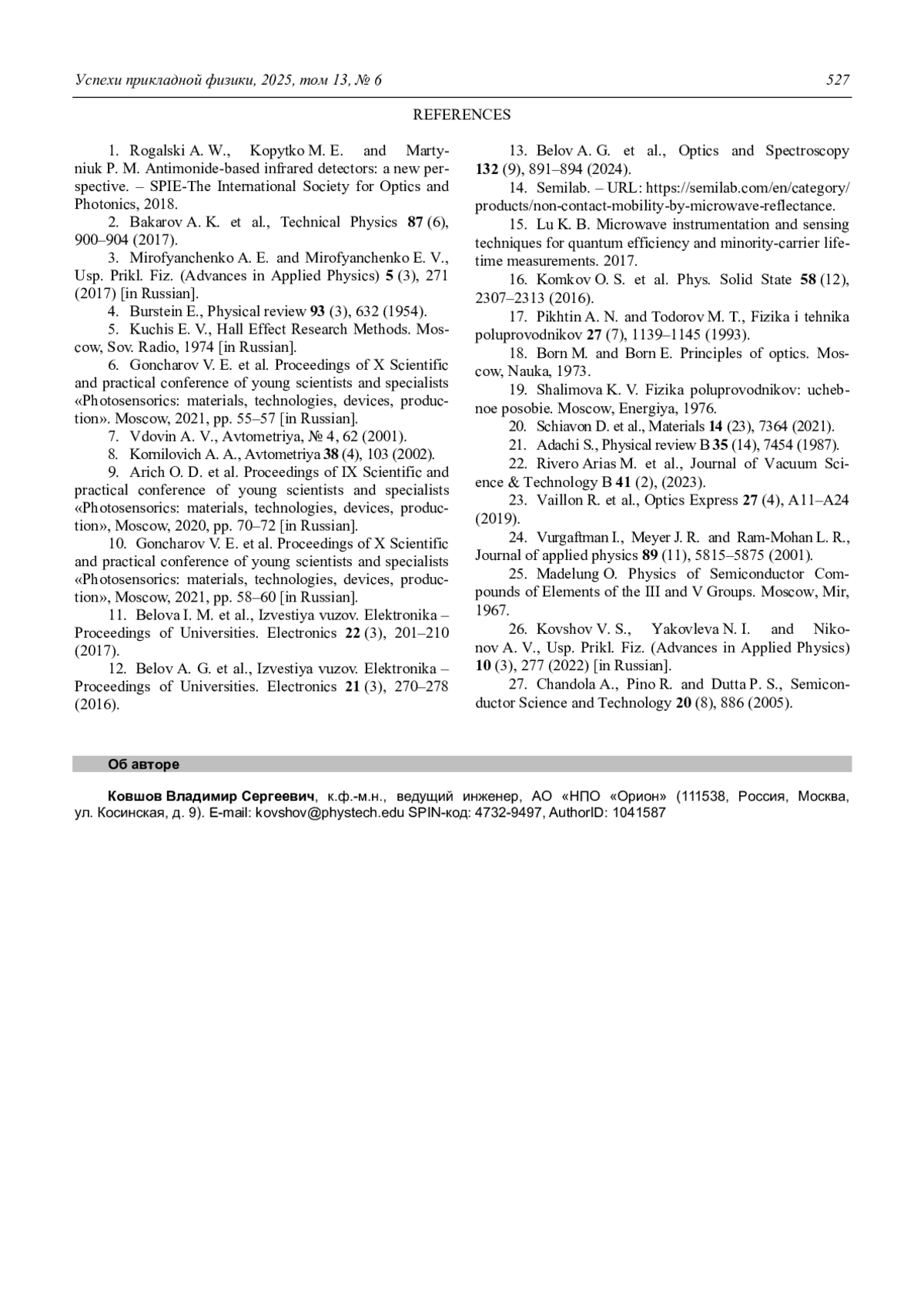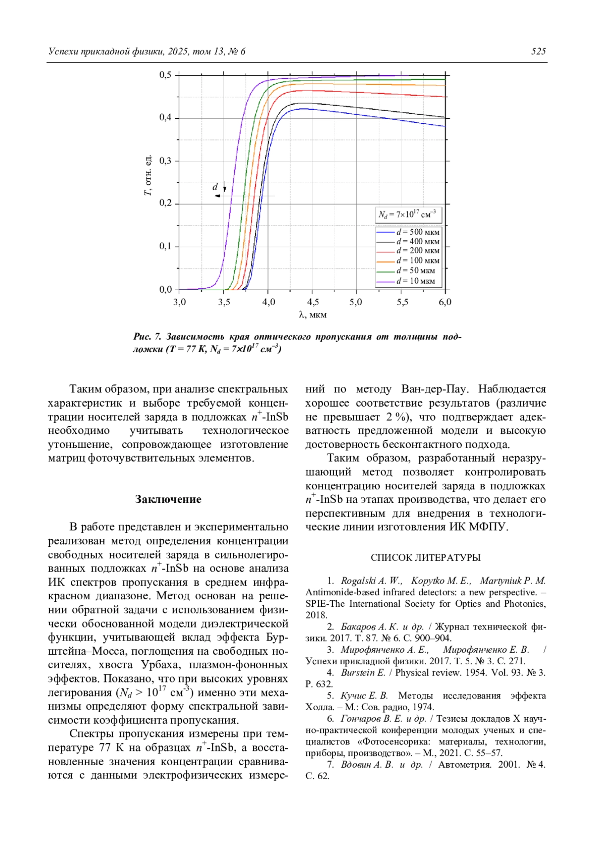 Представлен метод бесконтактного определения концентрации носителей заряда в сильнолегированных подложках n+-InSb на основе анализа спектров пропускания в среднем инфракрасном диапазоне (3–5 мкм) при температуре 77 К. Разработана физическая модель комплексной диэлектрической функции, учитывающая эффект Бурштейна–Мосса, поглощение на свободных носителях, хвост Урбаха и плазмонфононные эффекты, что позволяет корректно описать оптические свойства материала в условиях сильного вырождения. Решена обратная задача: путём сопоставления рассчитанных и экспериментальных спектров пропускания восстановлены значения концентрации носителей для двух образцов. Полученные результаты согласуются с данными электрофизических измерений по методу Ван-дер-Пау (расхождение не более 2 %), что подтверждает достоверность предложенного подхода. Метод перспективен для неразрушающего контроля концентрации носителей заряда в подложках n+-InSb в производственных условиях.