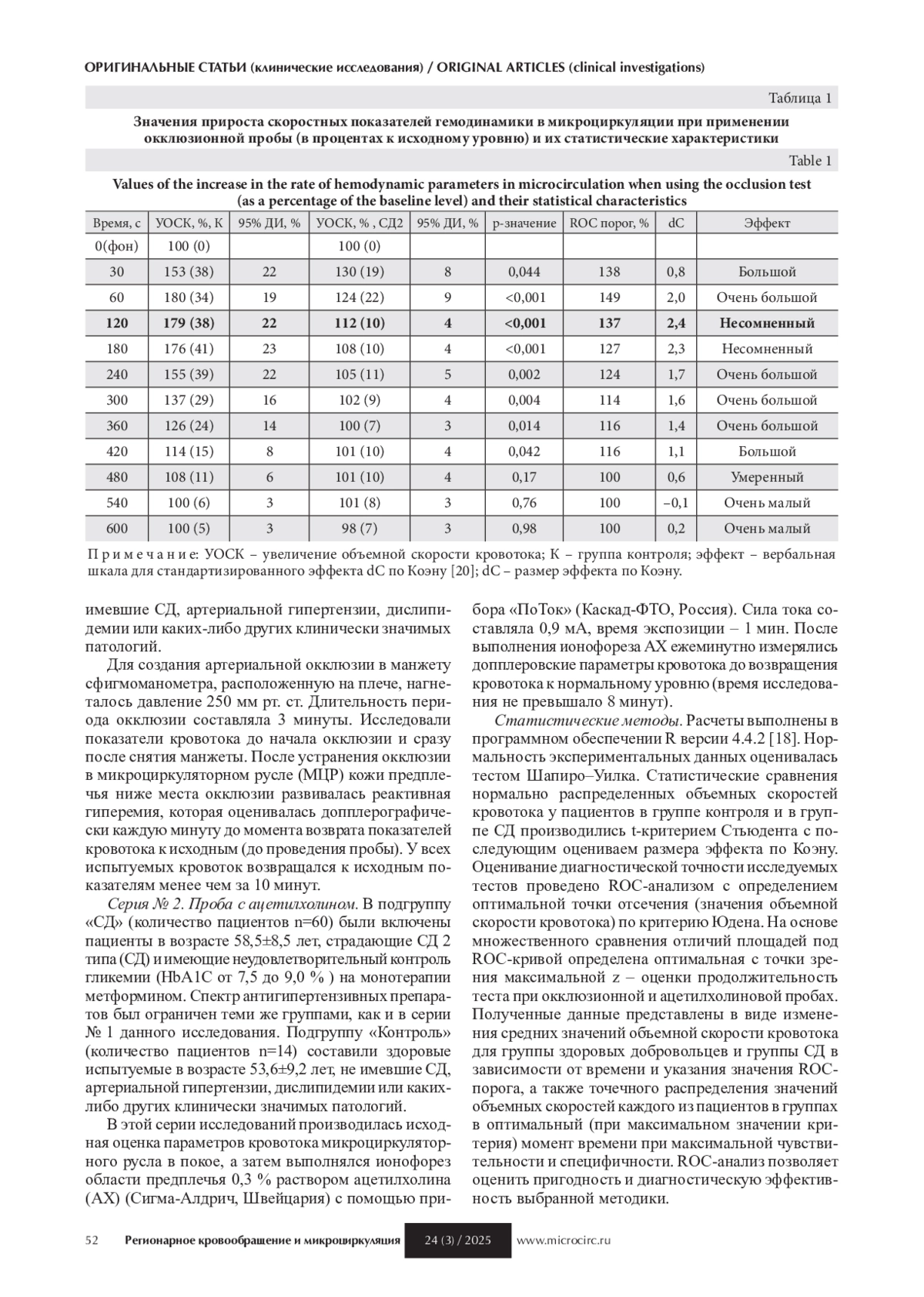 Многочисленные клинические и экспериментальные работы подтверждают, что нарушения эндотелий-зависимой вазодилатации формируются уже на ранних стадиях заболевания, нередко предшествуя манифестации клинических симптомов [1–9]. Дисфункция эндотелия – стойкое изменение структуры и/или функциональной активности эндотелия, приводящее к нарушению регуляции сосудистого тонуса, тромбозу и другим осложнениям [10]. Современная медицина направлена преимущественно на профилактику заболеваний, поэтому диагностические методики, способные определить доклинические формы патологии, а также вектор лечения и возможности улучшения прогноза заболевания оказываются весьма актуальными. Ранее мы изучали диагностическую эффективность методики поток-зависимой вазодилатации плечевой артерии. По результатам данного исследования, чувствительность и специфичность этой методики оказались очень невысокими – 69 и 62,5% соответственно, что недостаточно для диагностического теста [11]. Несмотря на широкое применение этой методики в научных публикациях, другие авторы также отмечали ее неэффективность [12]. Более того, даже в классических рекомендациях имеются указания на высокую вариабельность метода и подчеркивается, что для получения достоверных результатов необходима строжайшая стандартизация, которую трудно достичь в обычной клинической практике [13]. Именно поэтому в настоящем исследовании был применен другой, менее операторозависимый, и более воспроизводимый метод – ультразвуковая допплерография сосудов микроциркуляторного русла с функциональными пробами. Проведено сравнение реакции сосудов микроциркуляторного русла кожи предплечья на временную артериальную окклюзию («окклюзионная проба») – поток-зависимая вазодилатация сосудов микроциркуляторного русла (ПЗВД МЦР) и ответ на локальное воздействие (ионофорез) агониста мускариновых рецепторов – ацетилхолина. Оценивались различие этих методик не только у здоровых добровольцев, но и у пациентов с СД 2 типа, так как известно, что при этом заболевании, как правило, развивается дисфункция эндотелия [14–17].